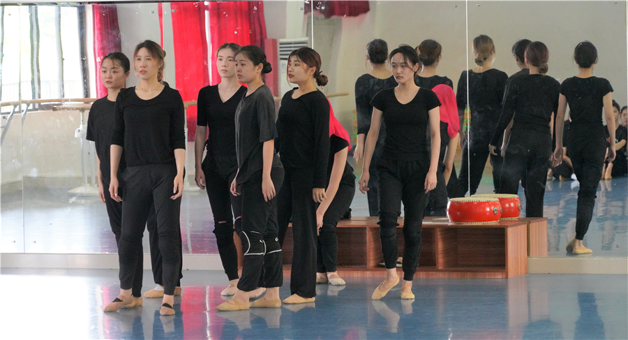 观看学生排练党史题材舞蹈《八女投江》