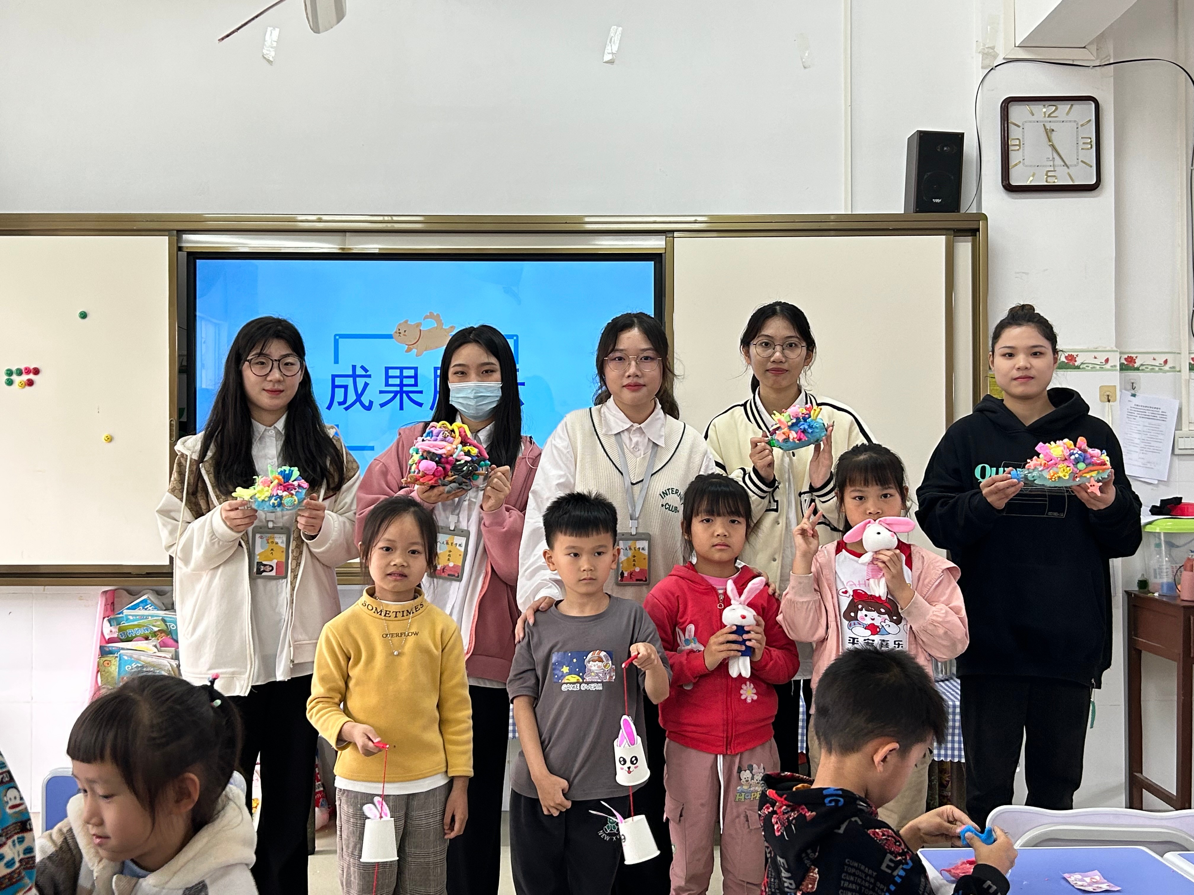 “筑”梦同行,与“艺”飞翔,通过本次教学实践活动,学前教育专业的学生将专业知识与教学实践相结合,通过创意手工和小朋友一起感受艺术的乐趣,同时不断增强自身专业实践能力和社会服务能力。(蒙剑英、冯小霞/摄)