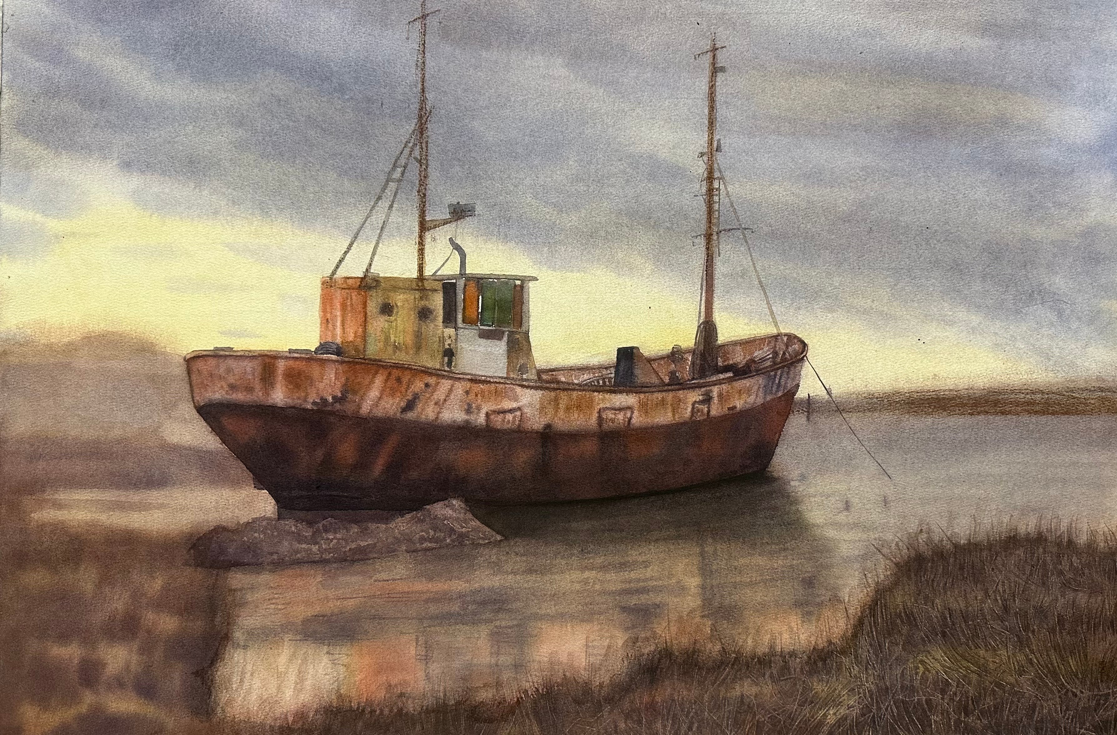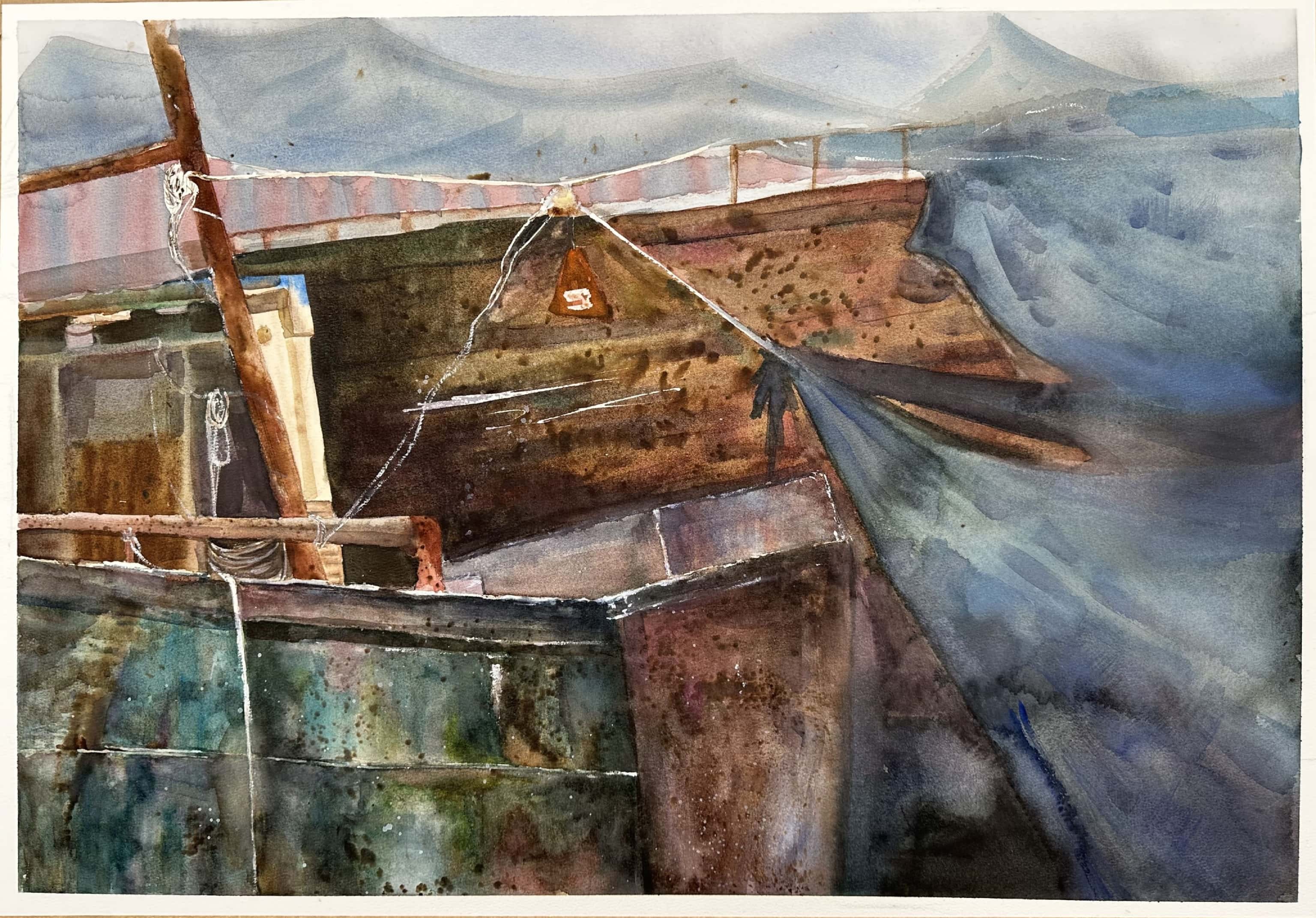 罗永在《搁浅的船》 49cm×72 cm  2023年 纸本水彩