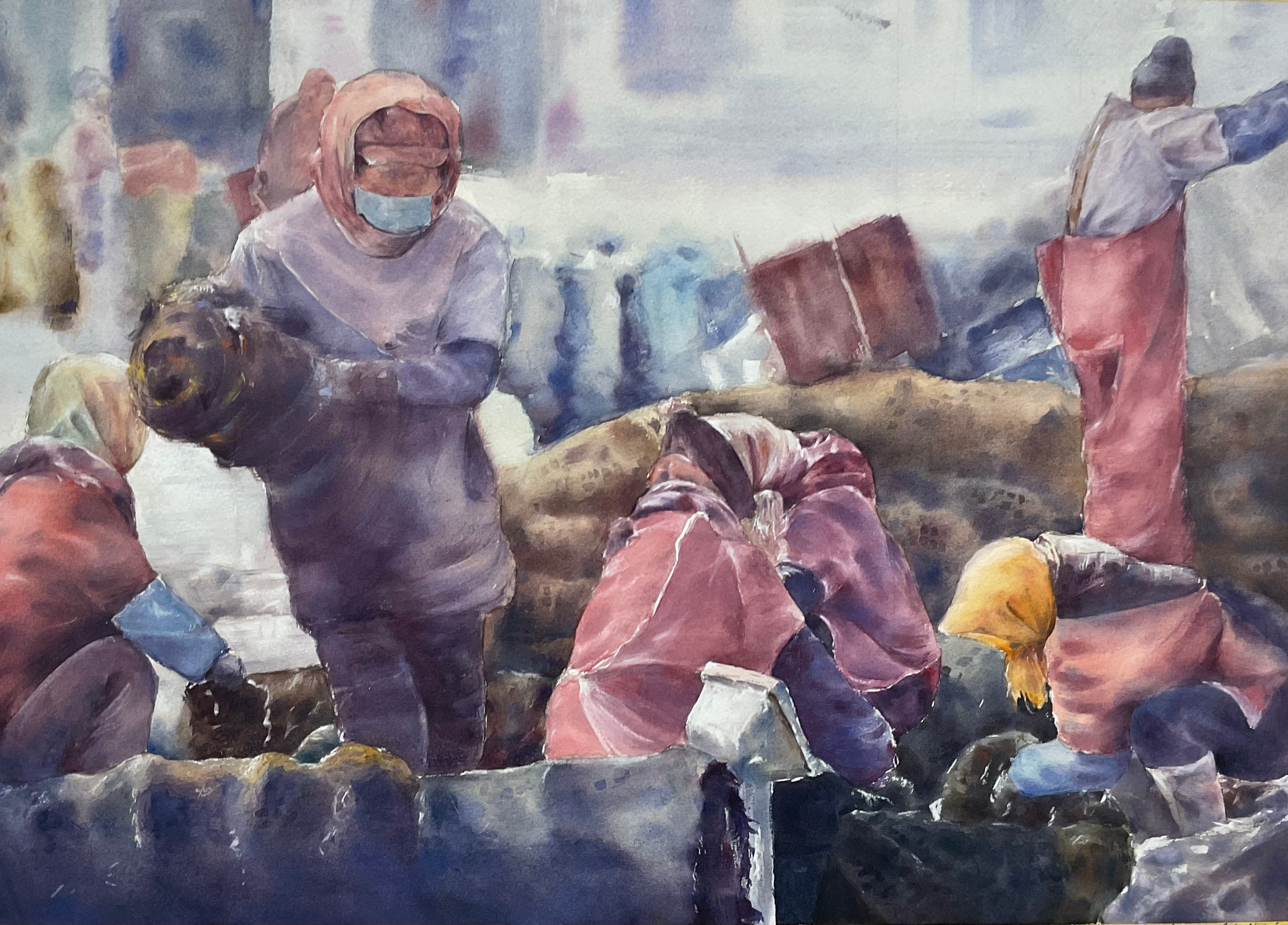 杨圆缘《进城的农民工》  52cm×52cm 2023年 纸本水彩