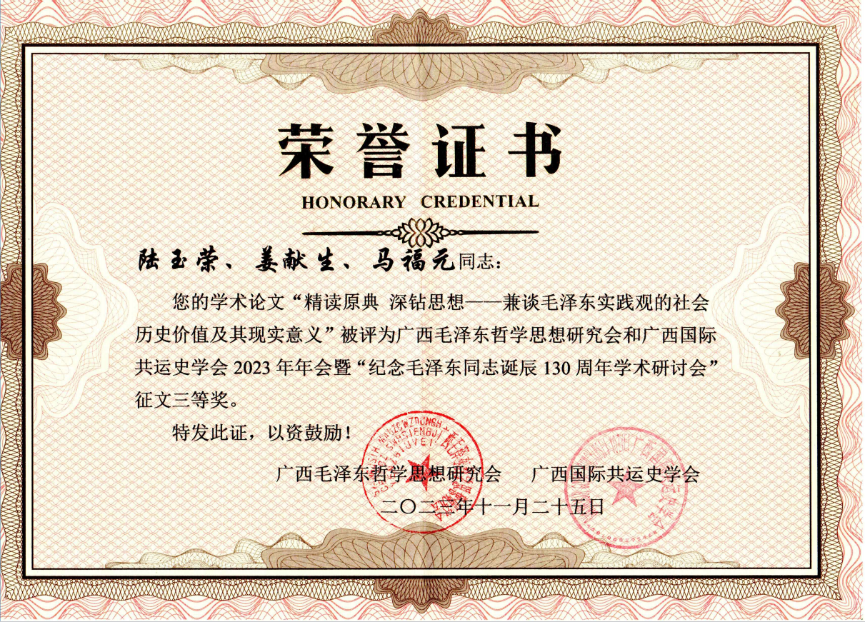 喜报:我院教师陆玉荣、姜献生、马福元学术论文“精读原典 深钻思想--兼谈毛泽东实践观的社会历史价值及其现实意义”被评为广西毛泽东哲学思想研究会和广西国际共运史学会 2023 年年会暨“纪念毛泽东同志诞辰 130 周年学术研讨会“征文三等奖