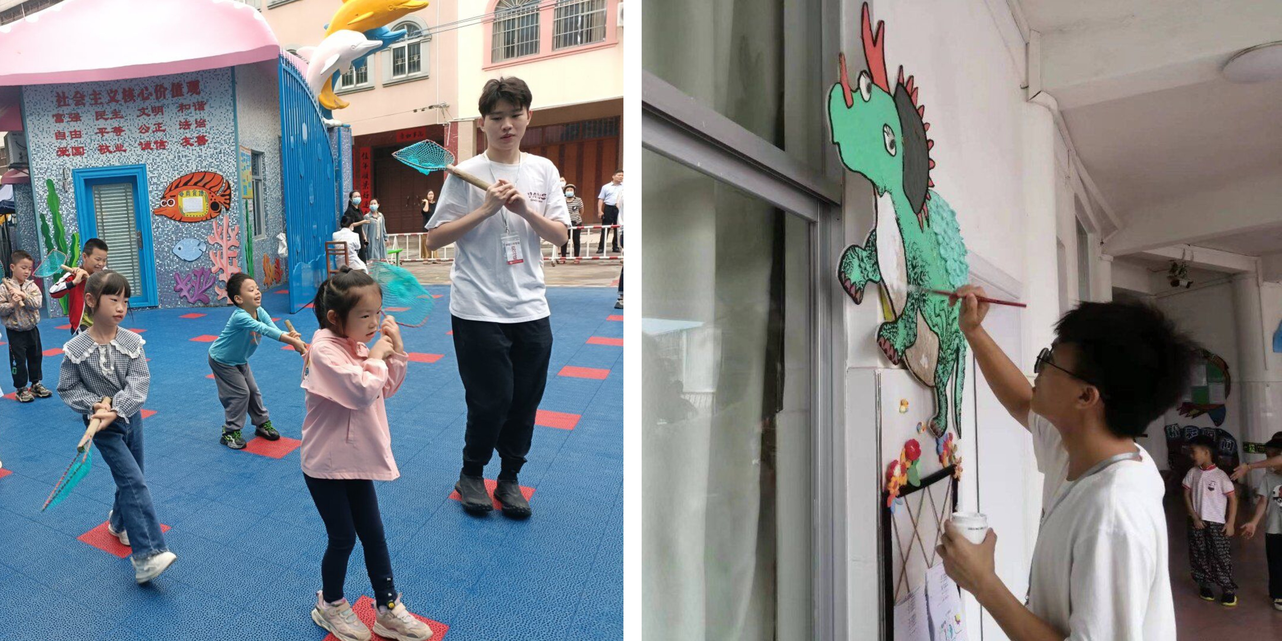 2102班见习生带幼儿进行早操 2102班见习生参与幼儿园环创活动