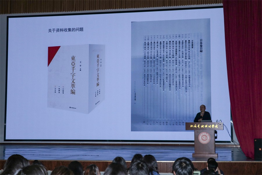 在对诸多版本的分享中,周博教授针对《千字文》在日本的集字、翻刻、改编等版本的作品中,探讨其在日本不同时期政治、经济、文化的历史背景下,对以日本为主的东亚文化艺术区域中在书法、教育、文字与文化等多方面产生的深远影响。在此次讲座中,周博教授反复强调在研究学习中资料收集的重要性,在对《千字文》不同版本的评析中,为现场师生生动讲授对资料分析校订、鉴别勘误的方法,并劝诫同学们在日常的学科研究中,应该结合多种不同版本的书籍,对其更加系统、深入地研究。