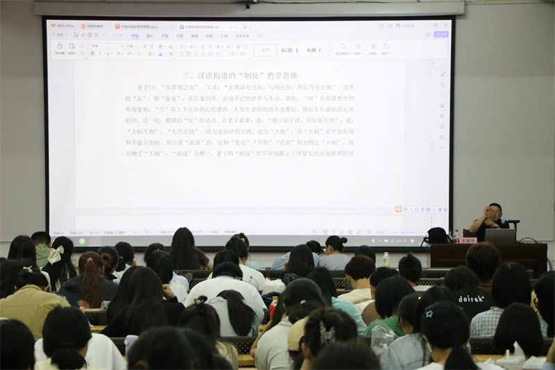 最后,王家年教授提到在老子哲学或理想世界中,自然是与人为相对立的概念,不同于人为而又高于人为的状态,是事物按照自身的本质规定和运行规则而自成的过程。王家年教授还进一步表示,道与万物各自然,中国人构造语言亦顺任“自然”的本性,“率性而为”或有所为而有所不为,方显其语言的质朴与玄妙,这就是汉语构造的哲学智慧。他鼓励广大师生要深耕研读、恳切学习,以更深入系统地了解汉语构造的哲学智慧。