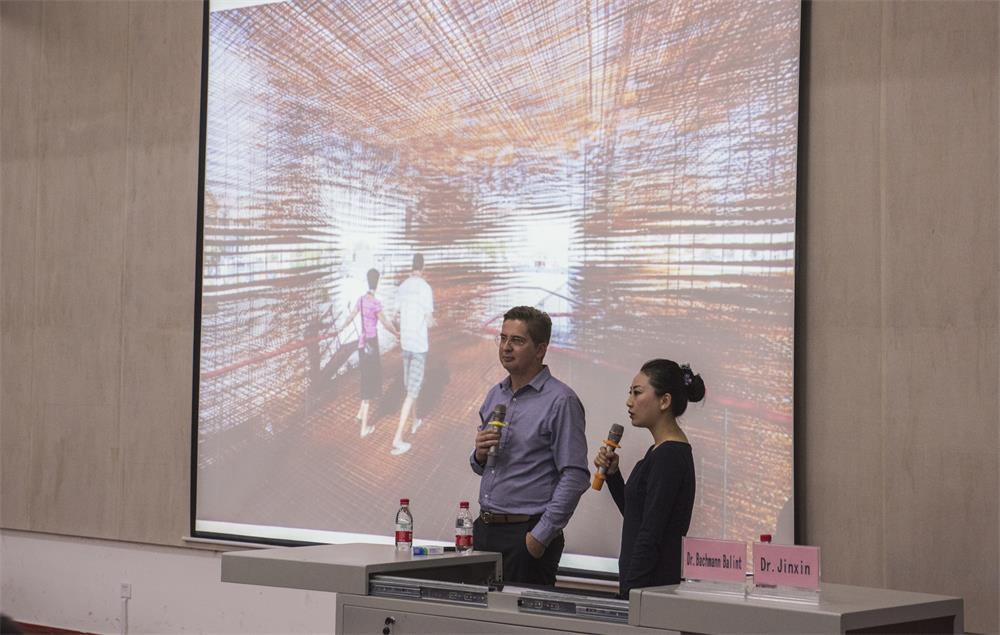 讲座中,Balint教授区别了欧洲和中国不同的设计理念:欧洲国家建筑设计擅于将新材料和新建筑与自然理念相结合,中国则往往是通过传统风格与现代技术相结合进行建筑设计。随后Balint教授用详细的案例给大家解释道:由于匈牙利曾经被各国殖民,所以在匈牙利能够看到不同风格特色的建筑设计。Balint教授还结合相关设计,介绍了他所在的工程与信息建筑学院“专注能源,建筑设计作品是与周边环境,温度相结合以节能环保为主”的设计学习方向,并向学生们展示了佩奇大学学生所设计出来的作品。Balint教授告诉大家:建筑设计师需要的是创造性思维和综合能力,要学会相互合作。