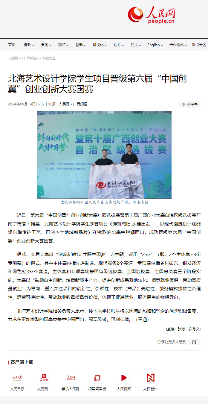 人民网:北海艺术设计学院学生项目在第六届“中国创翼”创业大赛国赛中获佳绩