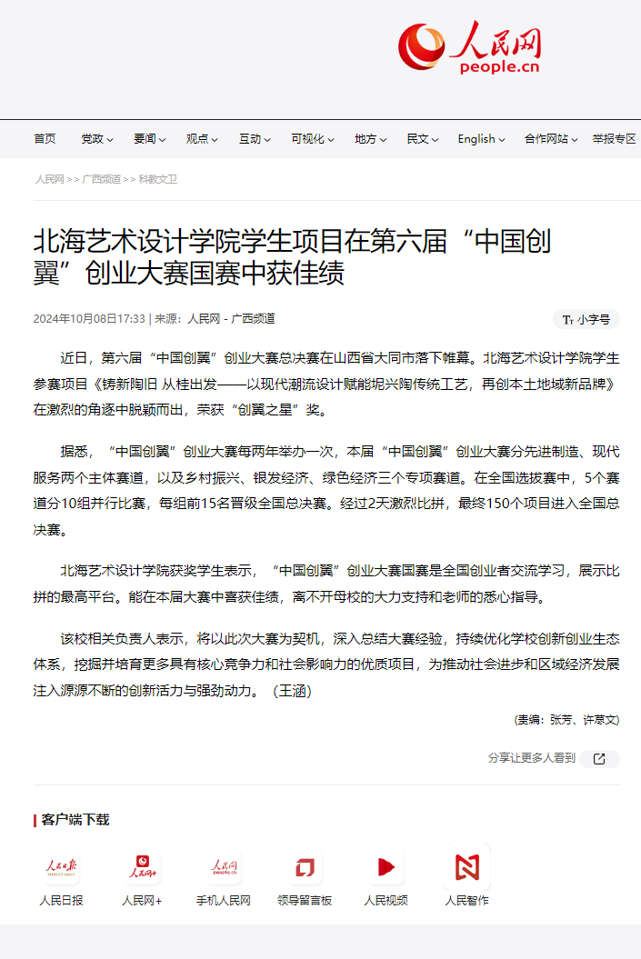 人民网:北海艺术设计学院学生项目在第六届“中国创翼”创业大赛国赛中获佳绩