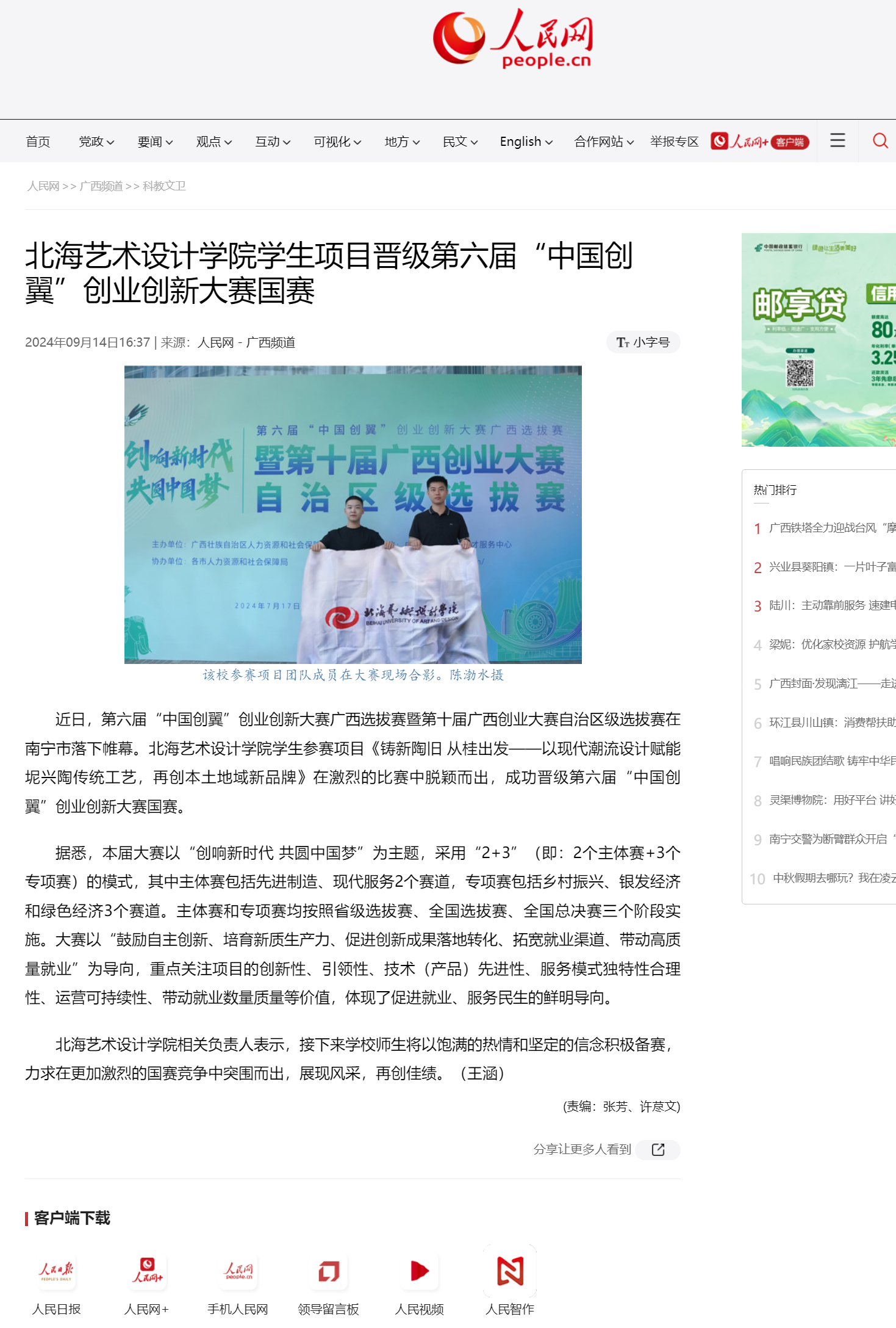 人民网:北海艺术设计学院学生项目晋级第六届“中国创翼”创业创新大赛国赛