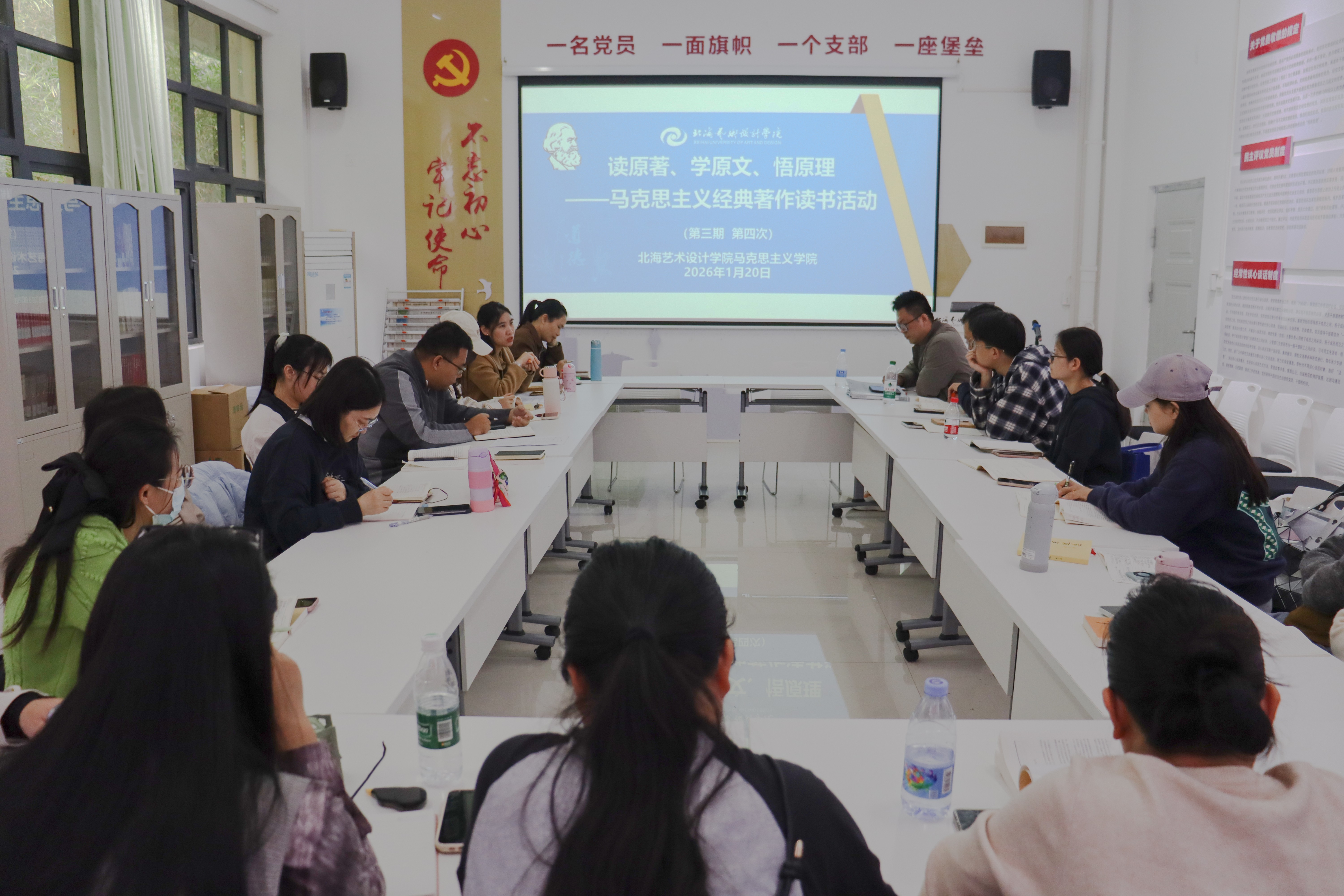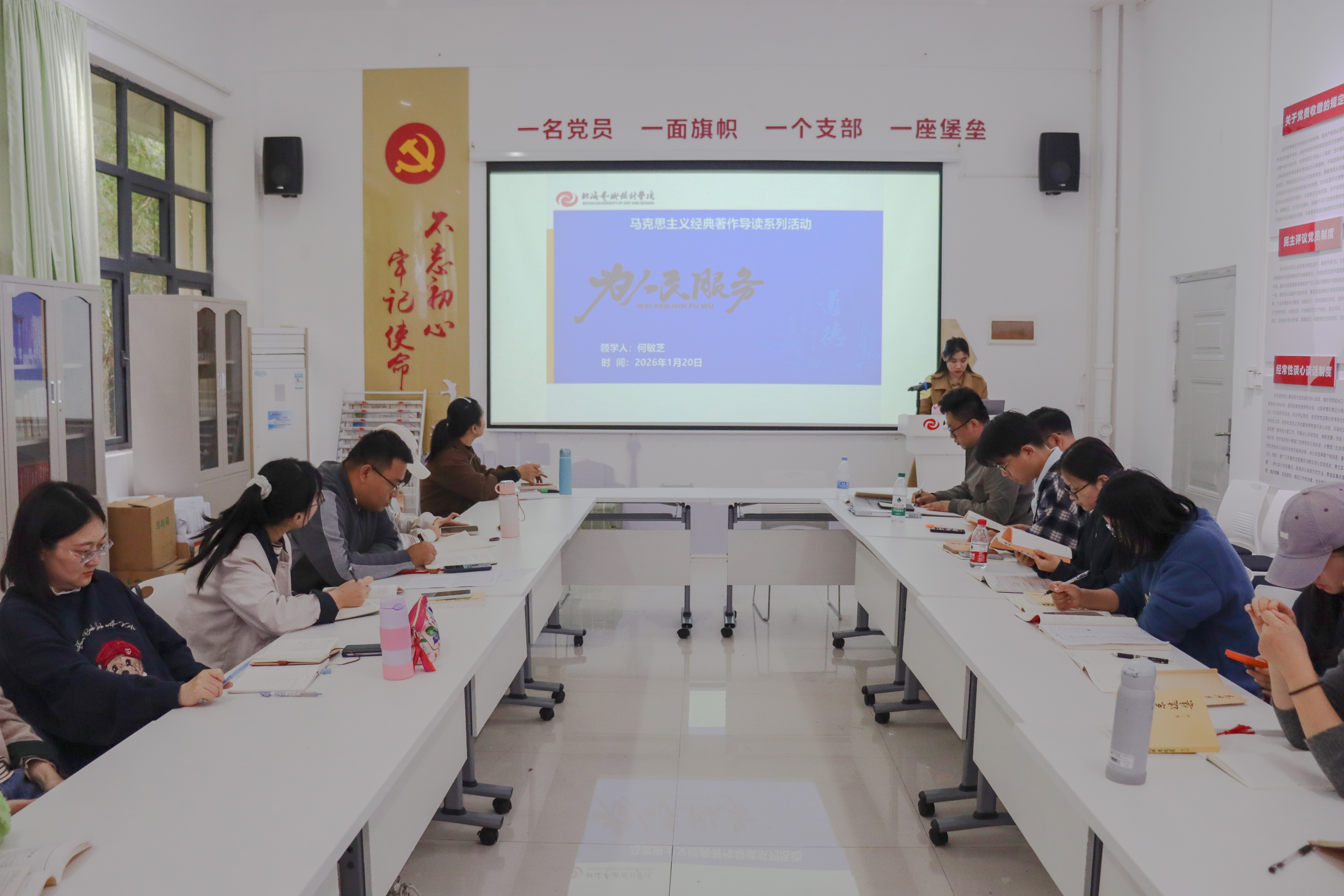 1月20日,马克思主义学院第三期马克思主义经典著作读书第四次活动在西校区行政楼103红色驿站举行。活动由马克思主义学院副院长张宇飞主持,马克思主义学院形势与政策及思政综合实践课教研室主任何敏芝副教授主讲《为人民服务》,学院全体中青年教师参加活动。