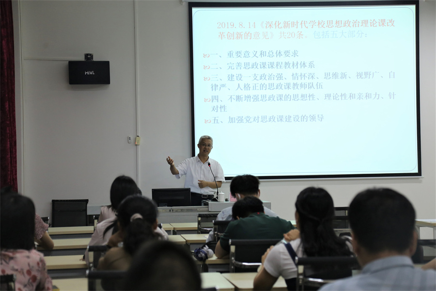 汤志华教授解读了文件的重要意义和总体要求,文件要求要完善思政课程教材体系,建设一支政治强、情怀深、思维新、视野广、自律严、人格正的思政课教师队伍。大中小学要循序渐进、螺旋上升开设思政课,大学阶段重在增强使命担当,引导学生矢志不渝听党话跟党走,争做社会主义合格建设者和可靠接班人。
