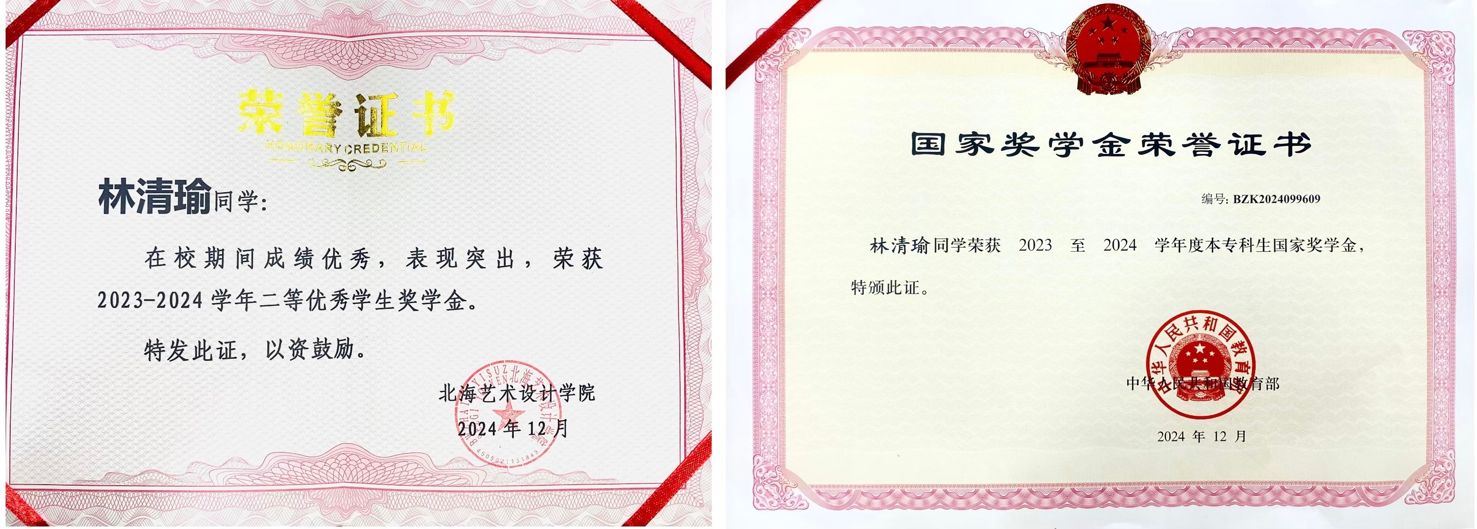 2024年9月荣获2023-2024学年北海艺术设计学院“优秀学生二等奖学金”;