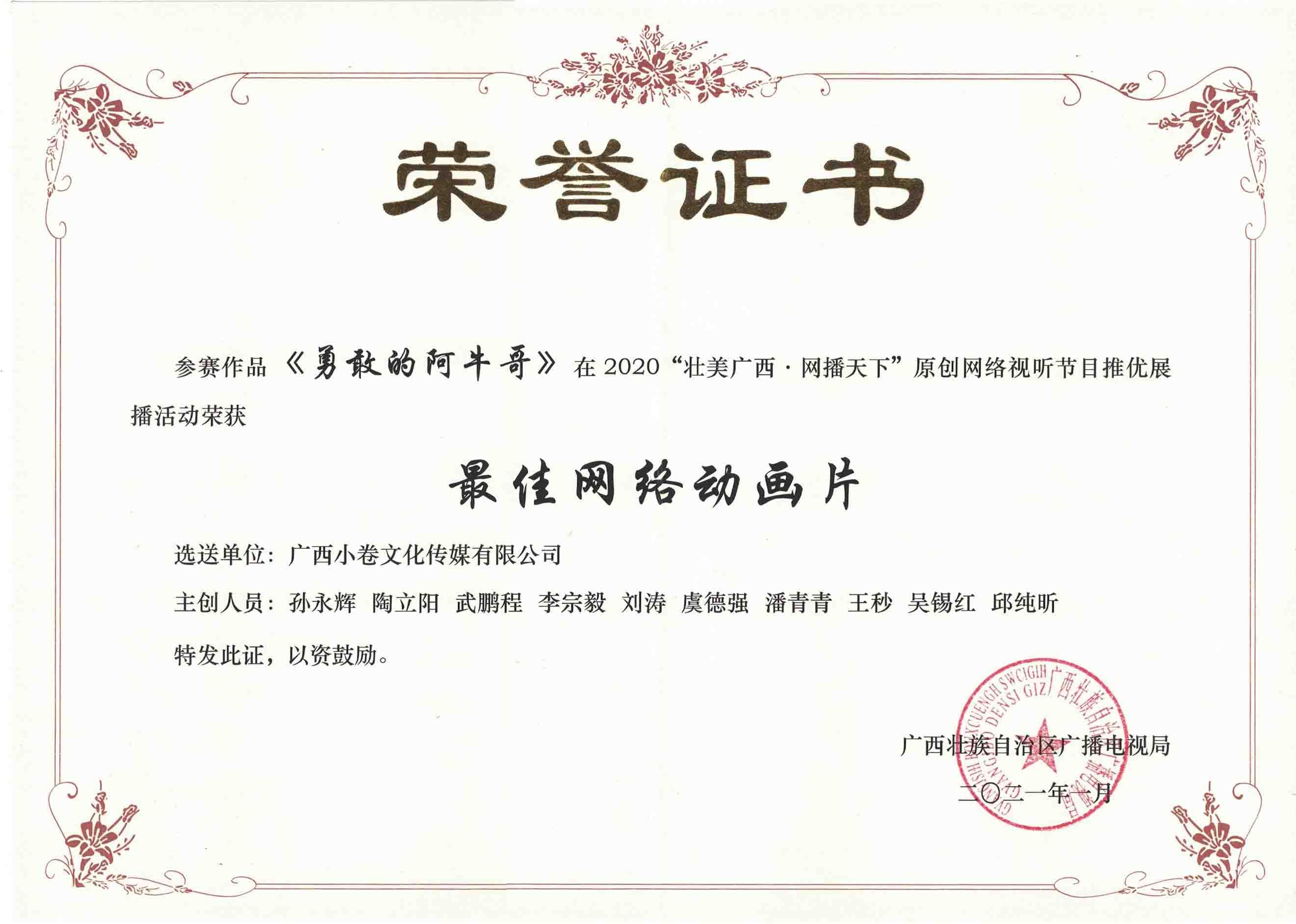 《勇敢的阿牛哥》2020“壮美广西-网播天下”原创网络视听节目推优展最佳网络动画片奖