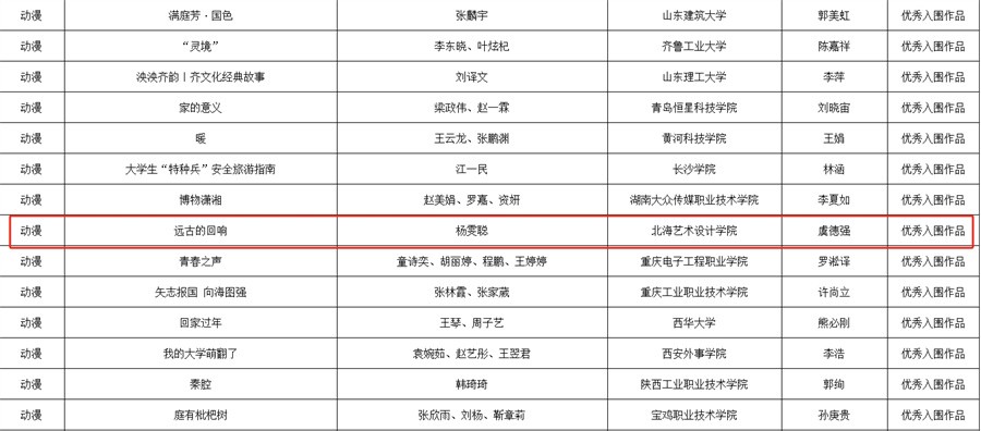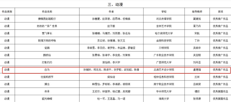 近日,教育部思想政治工作司发布了第七届全国大学生网络文化节和全国高校网络教育优秀作品推选展示活动入选名单,我校三件作品脱颖而出。在第七届全国大学生网络文化节中,动漫类《白马》入选“优秀推广作品”,《远古的回响》入选“优秀入围作品”;新媒体作品《守护》入选第七届全国高校网络教育优秀作品推选展示活动“优秀展播作品”。