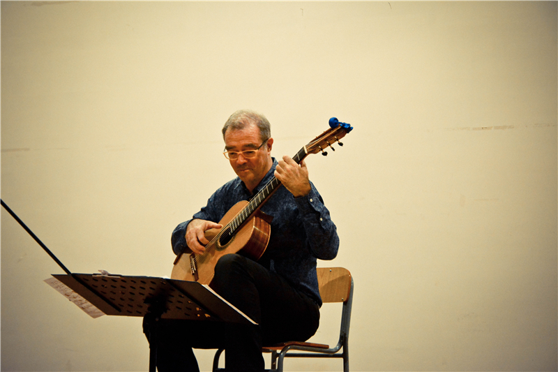 接下来,埃瑞克·佛朗塞利先生演奏了两首吉他独奏作品《阿尔罕布拉宫的回忆》与《阿斯图拉斯的传奇》,其精湛的演奏技巧让我们领略到音符跳动之趣,琴弦拨动之美,颇有“大弦嘈嘈如急雨,小弦切切如私语”之感。