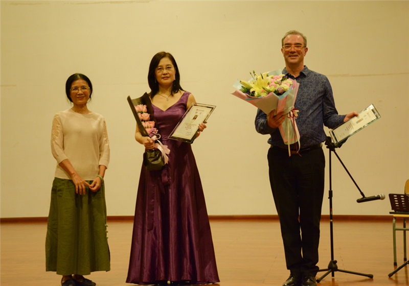 演出结束后,我校副校长、教育学院院长黄艳芳为两位艺术大师颁发了证书,聘请埃瑞克·佛朗塞利和郝雪雯为我校的客座教授,并合影留念。