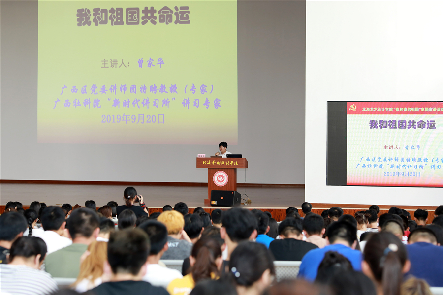 为庆祝新中国成立70周年,讲好中国故事、讲好中国共产党故事,进一步激发青年学生的爱国之情、强化爱国之志, 9月20日下午三点,由自治区党委宣传部、自治区党委党史研究室、自治区党委教育工委联合举办的“我和我的祖国——共和国故事进校园”百场主题宣讲活动在我校大礼堂举行。广西社科院哲学研究所所长、中国特色社会主义理论体系研究中心主任曾家华应邀作为本次宣讲的主讲人。我校各部门、各二级学院领导以及2019级700多人新生代表到场聆听讲座。活动由我校党委书记李高南主持。