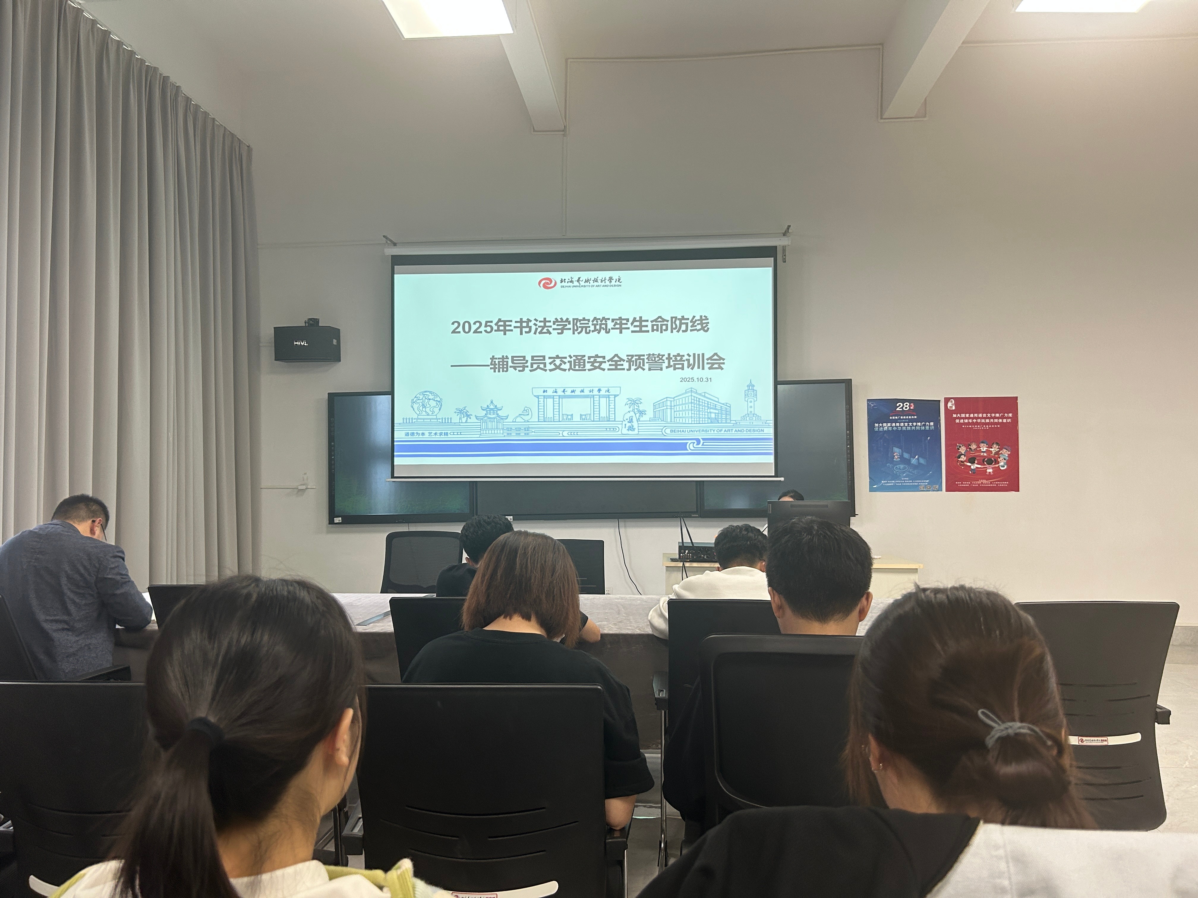 为进一步加强校园安全管理,提升辅导员队伍应对交通安全风险的能力,切实保障学生生命财产安全,10月31日下午,书法学院学工办于艺德楼507教研室召开了“筑牢生命防线——辅导员交通安全预警培训会议”。书法学院党支部书记喻广林、副书记左云飞,学工副院长李家琪、黄荣婷、韦志忍及全体学工教师、辅导员参加此次培训。会议由学工办主任胡慧捷主持。