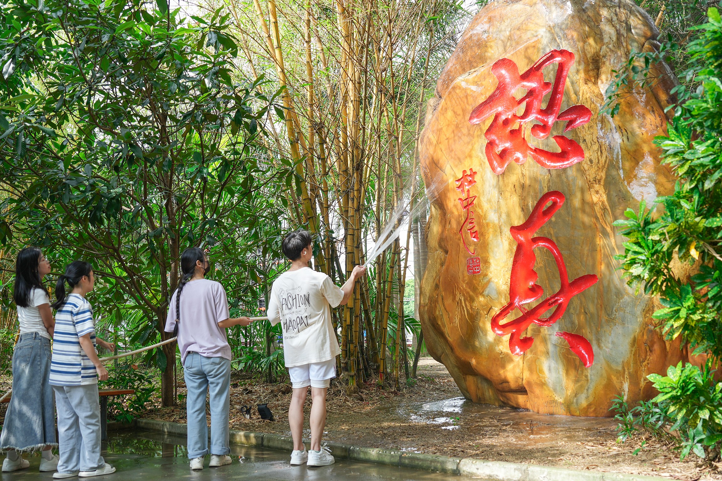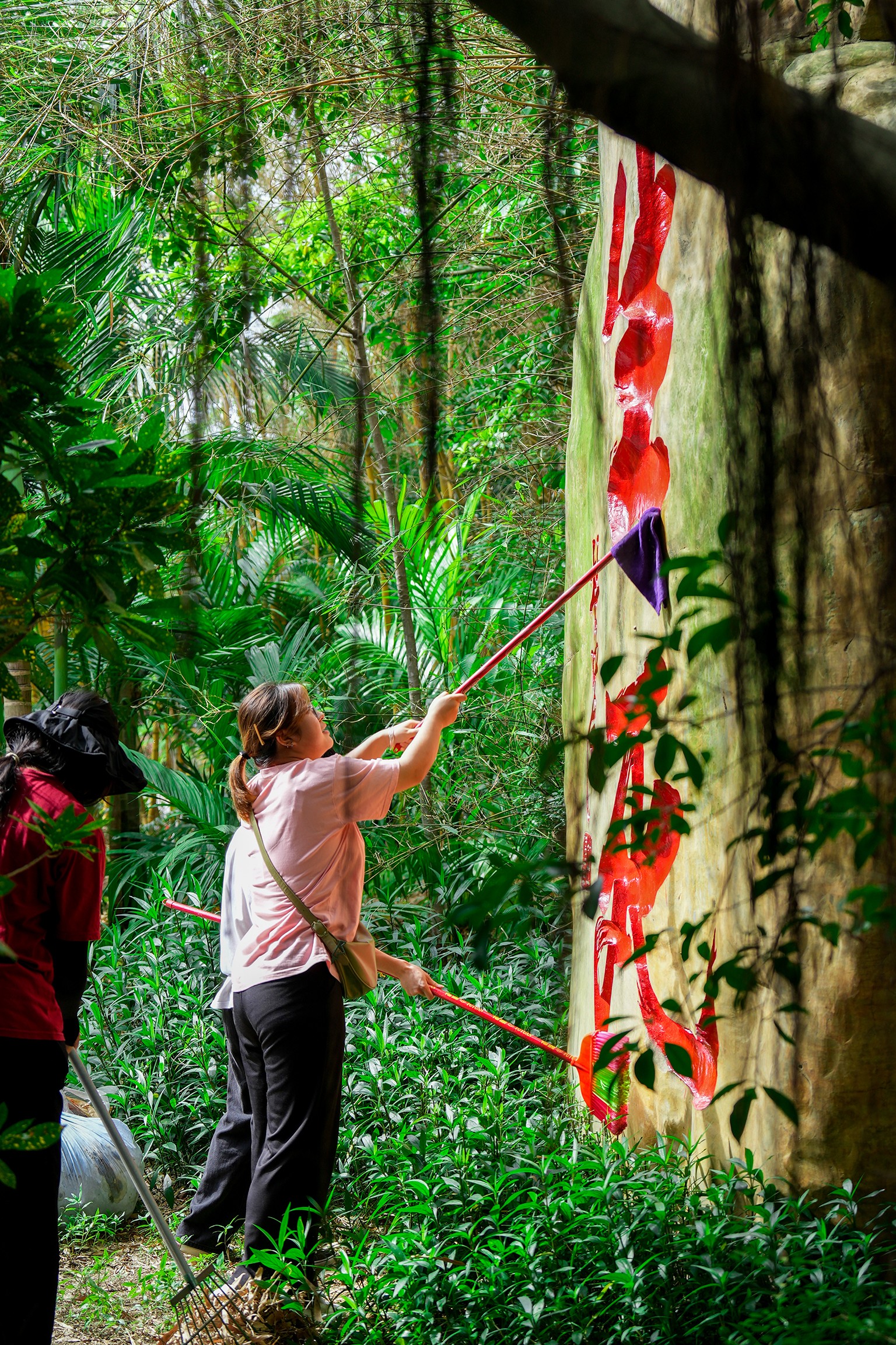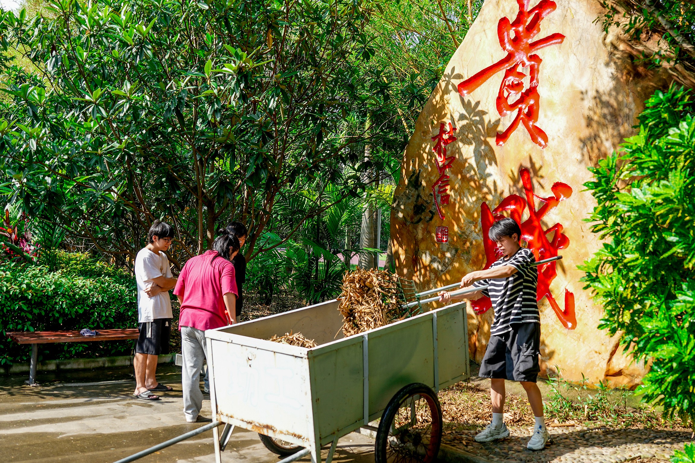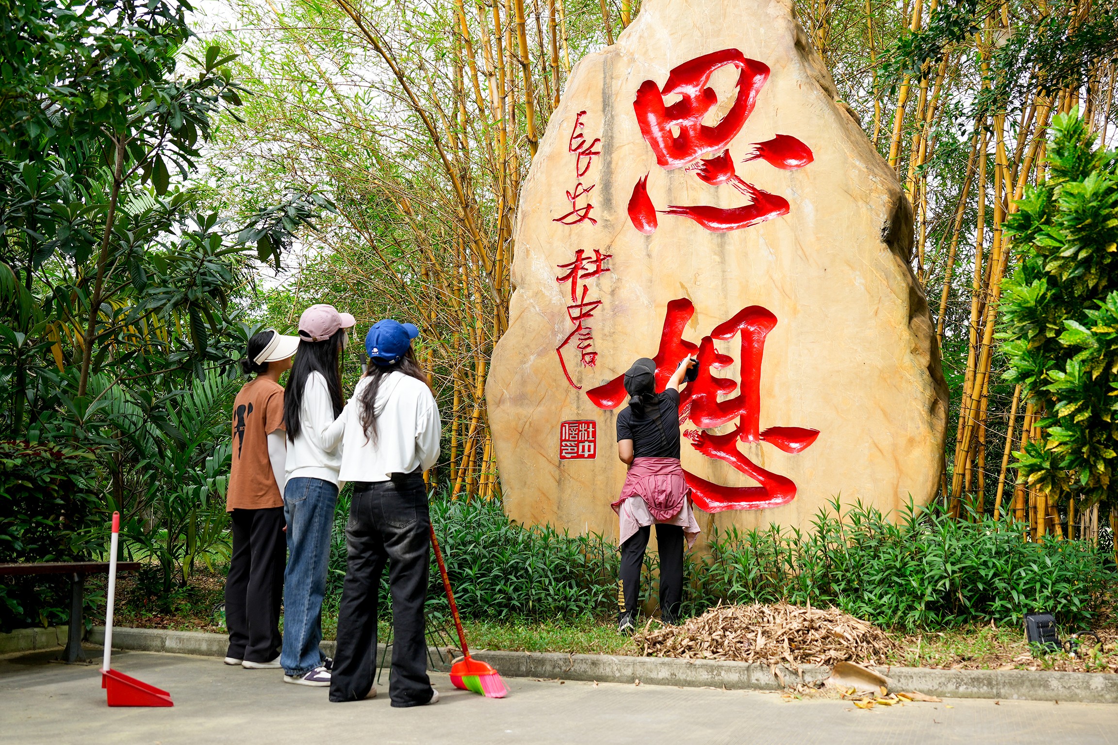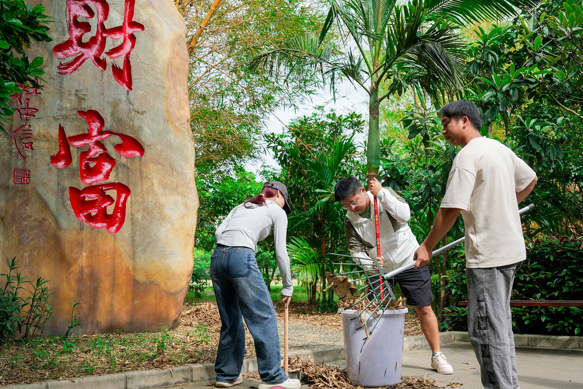 他们手持清洁工具,齐心协力清扫石刻文化林,用实际行动展示了他们的爱国情怀和社会责任意识。