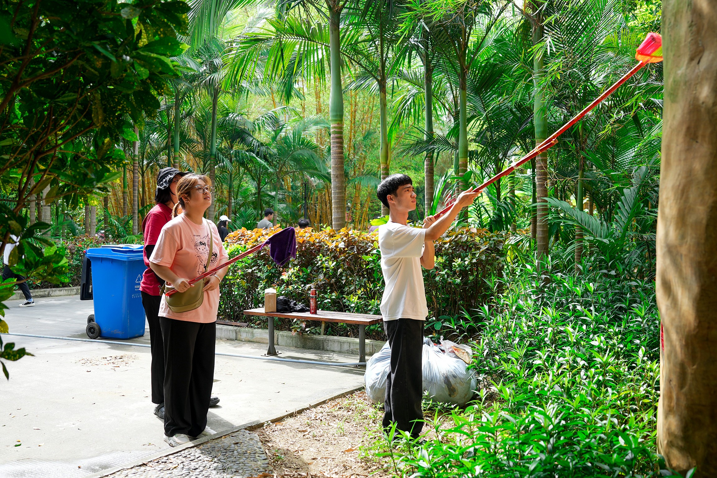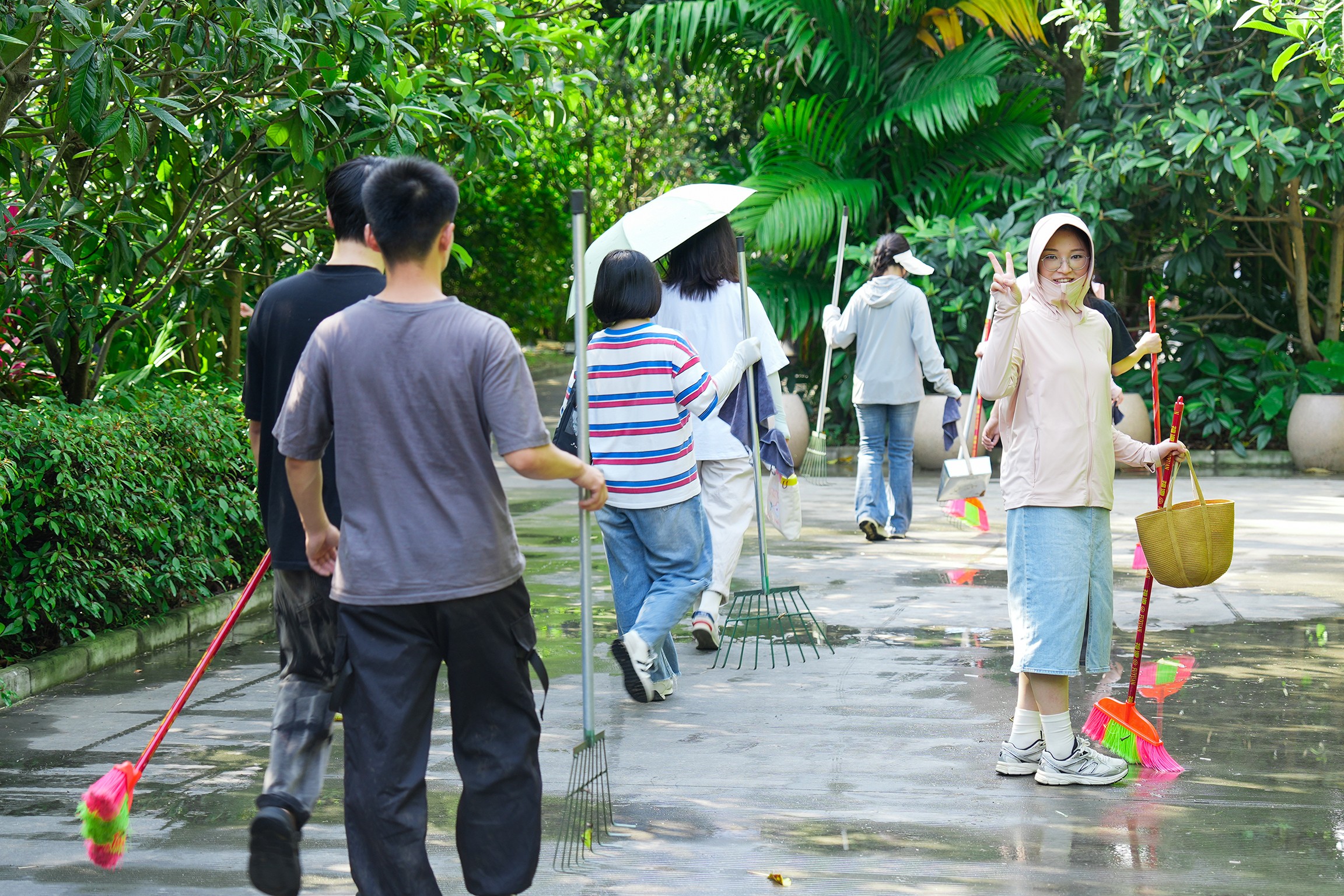 志愿者们手持清洁工具青春洋溢