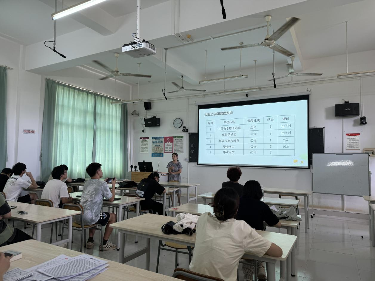 随后,覃传茵老师给即将上京的同学们具体介绍了第四学年的教学计划。她以专业人才培养方案为基石,深入结合北京这一历史文化名城所蕴含的丰富资源,以及课程要求、就业趋势和学校管理等要求,对《毕业考察与教育》《毕业实习》和《毕业论文》三门课程的目的及意义进行了全面而深入的解读。覃传茵老师强调,《毕业考察与教育》不仅是一次对专业知识的实践检验,更是同学们深入了解北京乃至中国历史文化,发掘其中蕴含的哲学思想的重要机会。她鼓励同学们要带着问题去学习,通过观察、体验和思考,发现身边环境所蕴含的深刻哲理。在《毕业实习》方面,覃传茵老师希望同学们能够结合自己的专业兴趣和职业规划,在北京寻找合适的实习机会,通过实际操作,提升自己的专业素养和综合能力。最后,对于《毕业论文》课程,覃传茵老师强调了毕业论文写作过程中的重要时间节点,提醒同学们要合理安排时间,按时完成论文的撰写工作。在写作过程中,同学们需要充分发挥哲学思维,对论文主题进行深入地思考和研究,体现自己的创新思想和独特见解。通过强调《毕业论文》的时间节点和写作要点,覃传茵老师希望同学们能够充分认识到毕业论文的重要性,认真对待论文的撰写工作,不断提升自己的学术水平和综合素质。
