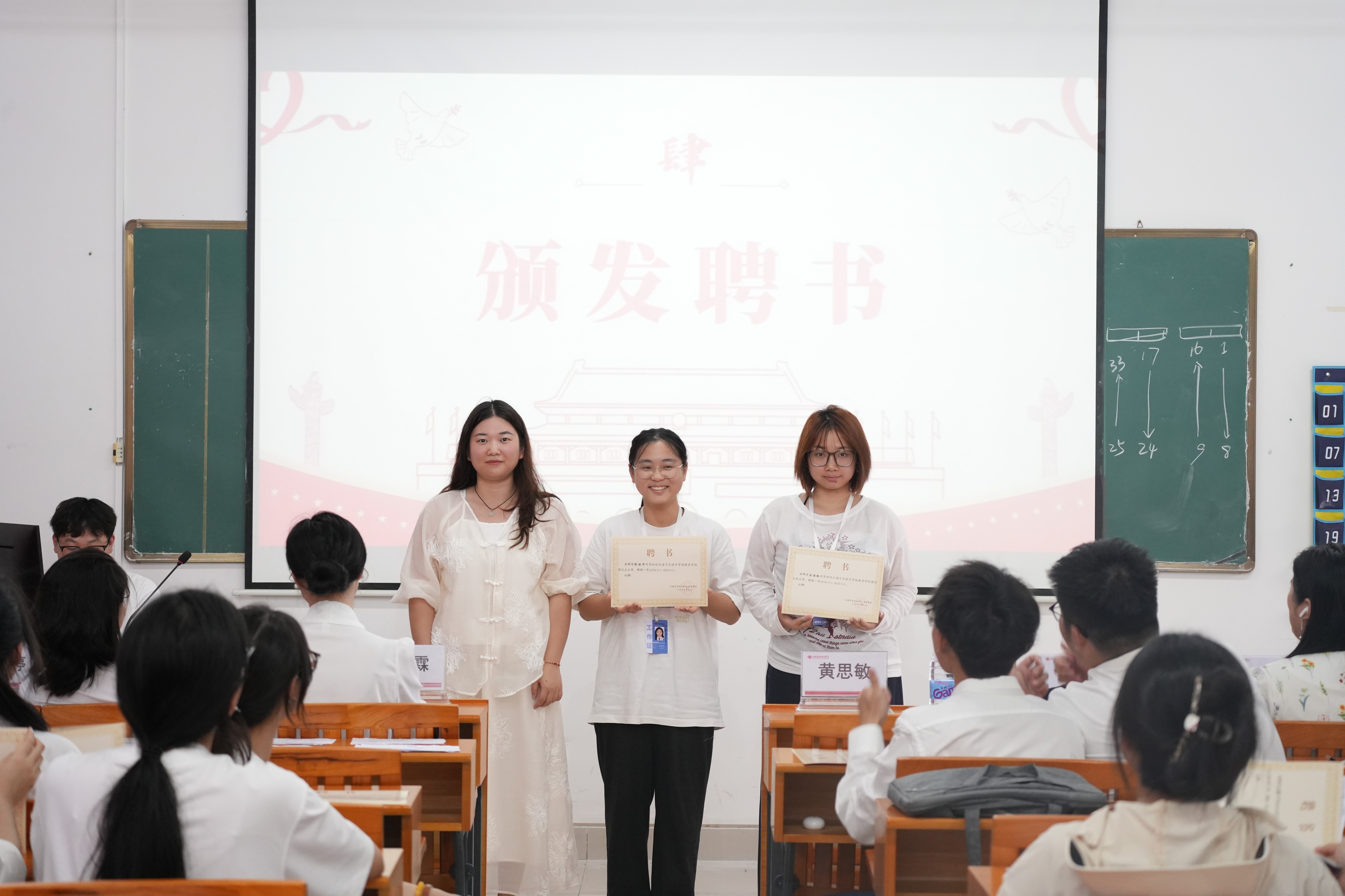 大会第四项议程是为学生干部颁发聘书。各位教师代表为团总支干事颁发聘书,指导老师陈美霖向表现优异的学生干部颁发2024-2025学年第二学期先进个人荣誉证书。一纸证书肯定其在本学期工作中的积极付出与出色表现,更承载着责任与信任,激励学生干部们在未来工作中继续践行初心,为团总支建设贡献力量。 教师代表给学生干部颁发聘书
