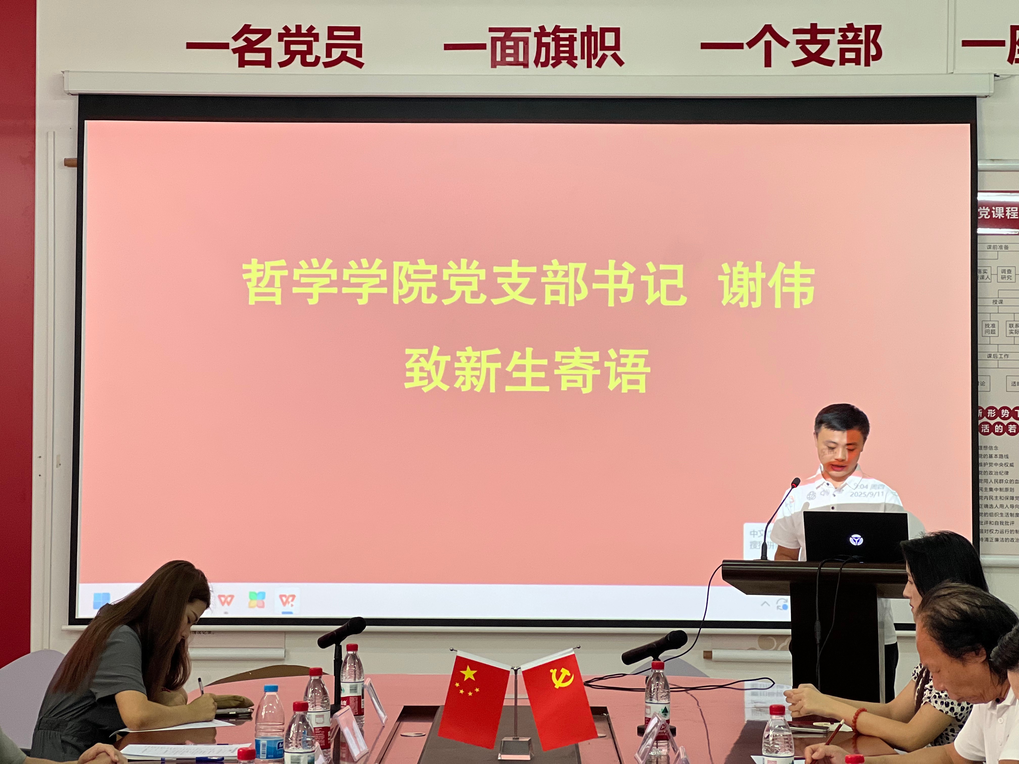 会议第一项议程,向新生致欢迎辞。李水亮常务副院长首先代表学院全体师生向哲学专业2025级新同学的到来表示热烈欢迎,祝贺新同学们开启人生新旅程。他希望同学们能充分利用我校办学特色和优势,丰富自己,学有所成。随后,学院党支部书记谢伟寄语新生,合理规划大学生活,树立远大理想,脚踏实地,做一个兼具良好学术素养和道德修养的优秀青年。