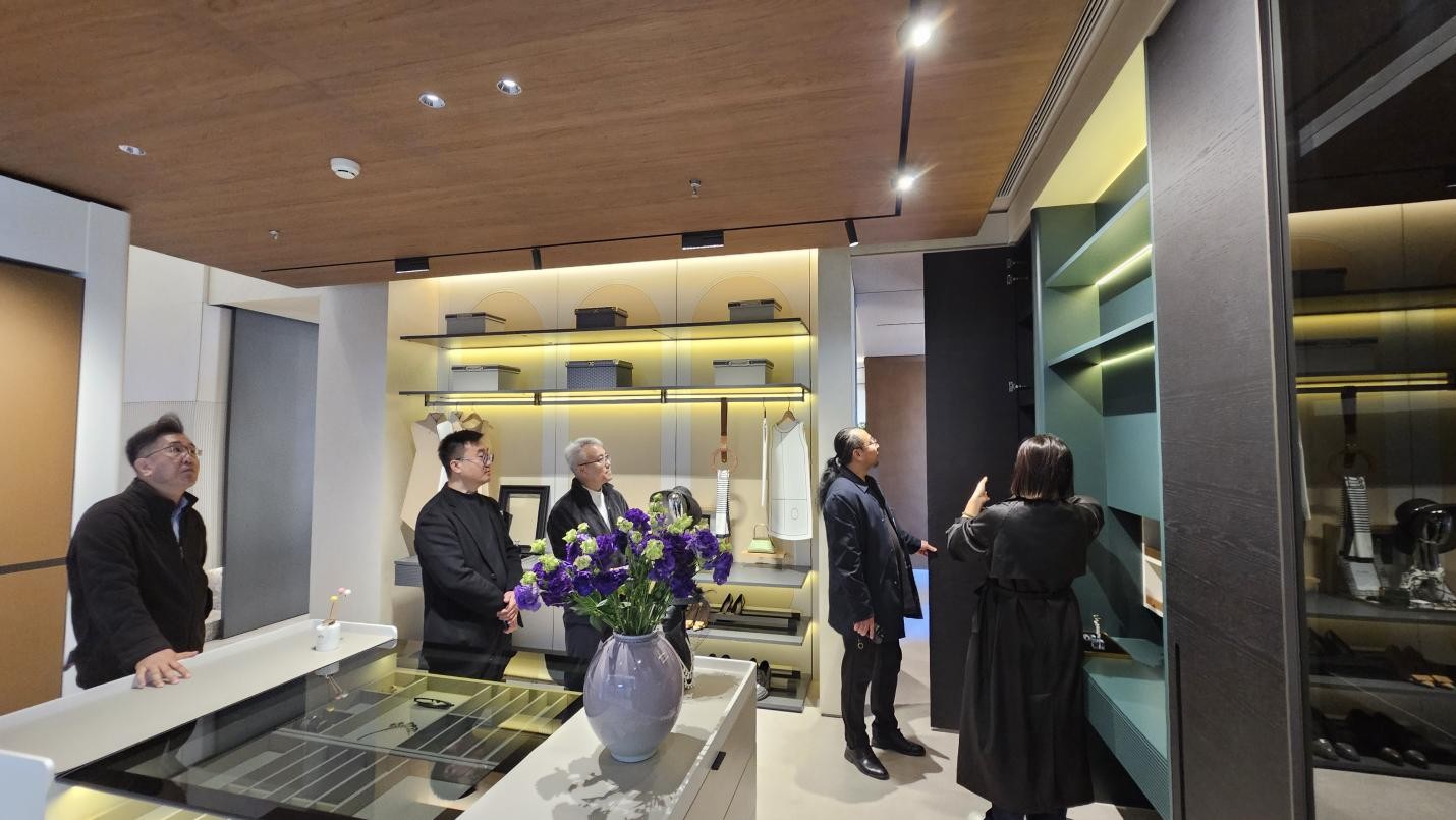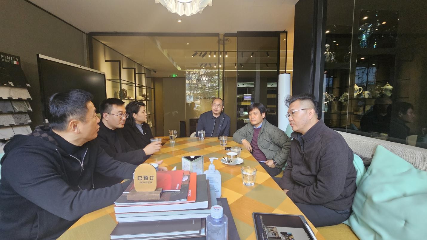 团队还专程前往由我院04级优秀毕业生陈利珍创办的予舍方元工作室,了解其以主营乔金斯高端整木定制品牌为核心,聚焦“空间全案定制+生活美学赋能”的高端整木定制与空间全案服务。陈利珍向走访团队详细介绍了工作室的发展历程、业务范围及核心设计理念,并分享了毕业后从行业新人成长为创业带头人的经验。