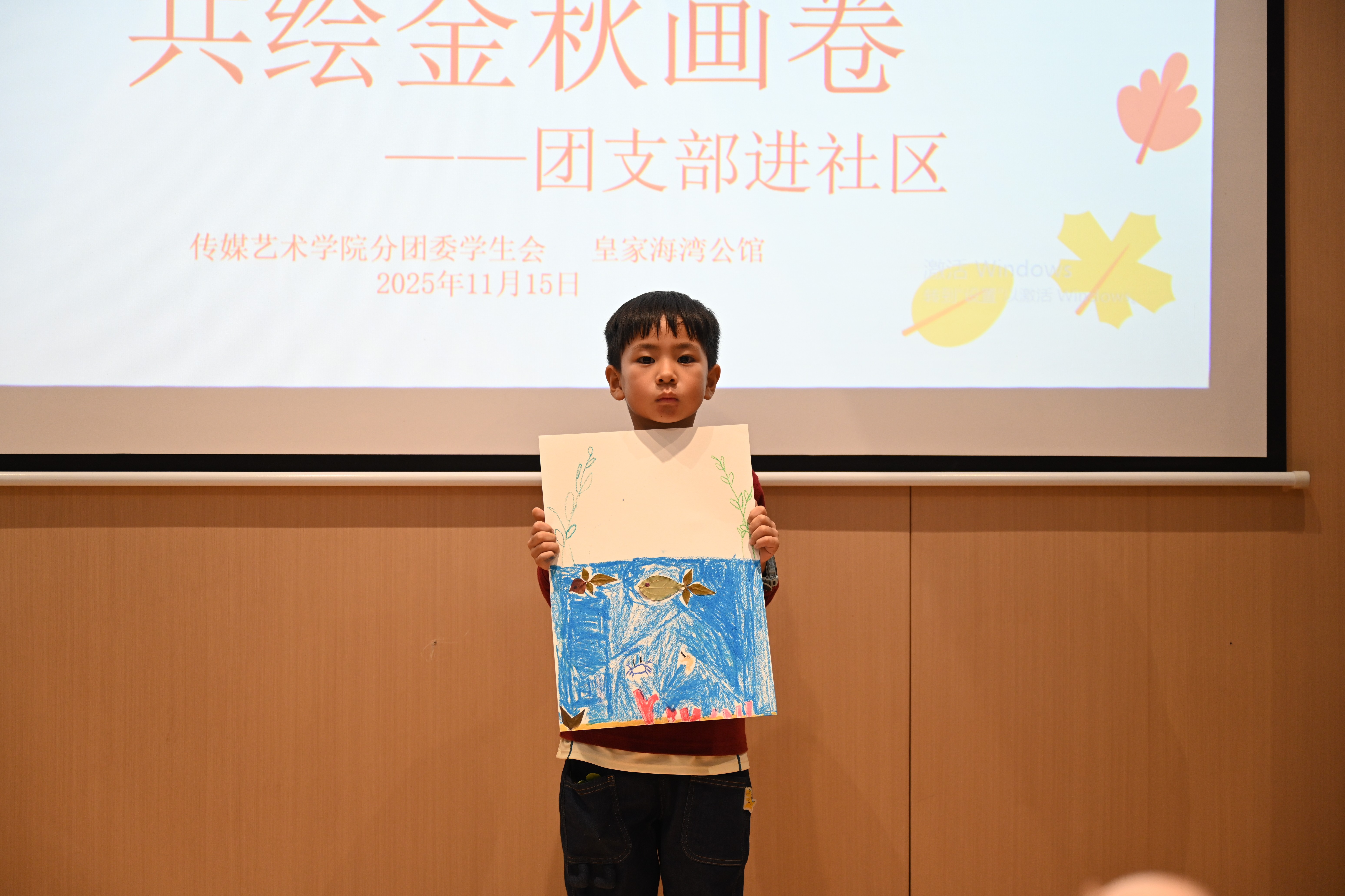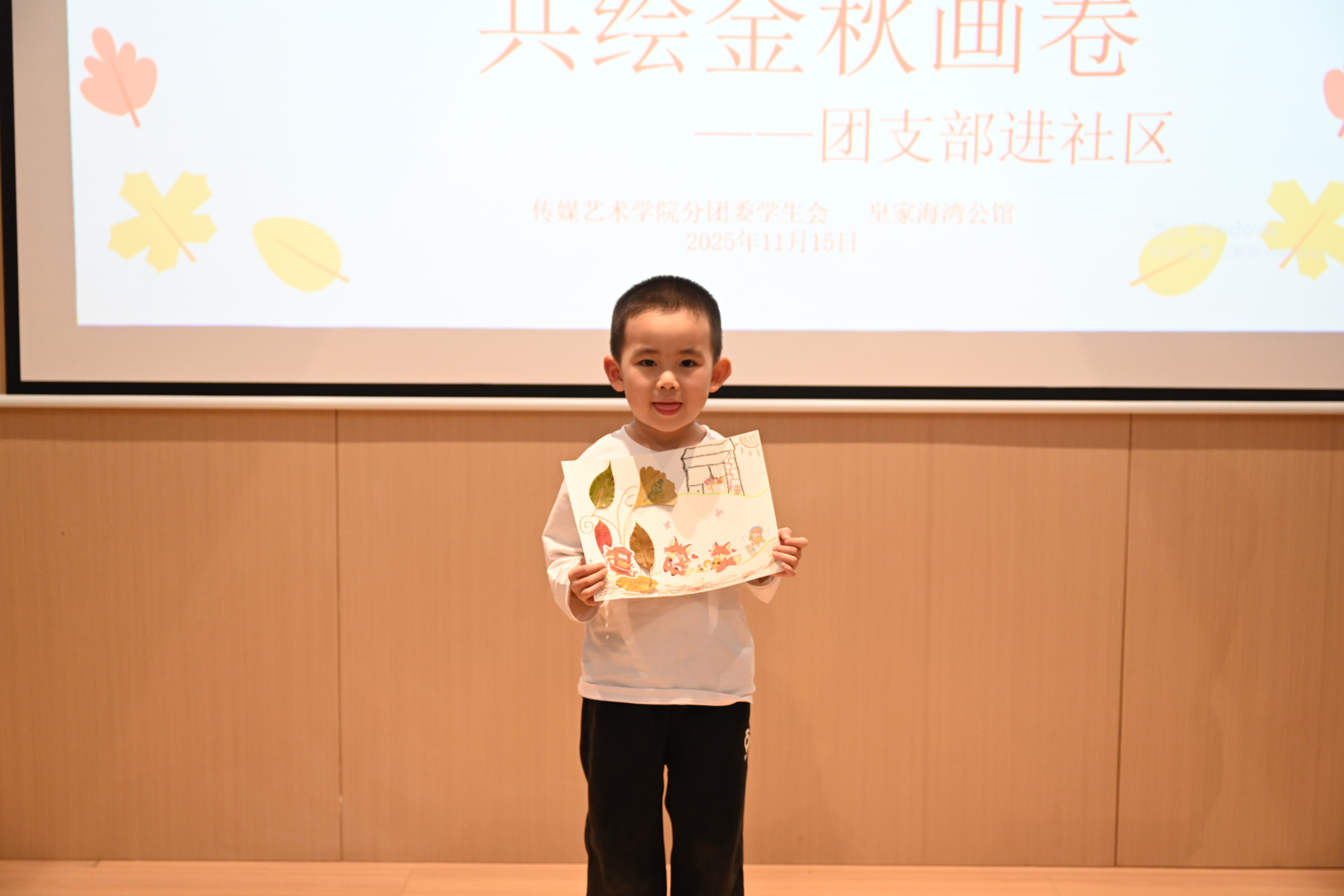 “亲子绘画”环节在社区共享会议室温馨开启。传媒艺术学院的志愿者们充分发挥专业特长,化身“艺术导师”,耐心引导小朋友们展开想象,在洁白的画纸上共同描绘秋天的故事。以“我眼中的秋天”为主题,孩子们在志愿者一对一陪伴下,挥洒童真色彩——金黄的落叶、高远的蓝天、欢笑的家人、嬉戏的身影……一幅幅充满生命力的图景在画笔下渐次绽放。原本静谧的会议室,化作一片流动的色彩海洋,洋溢着童趣与温暖的创作气息。