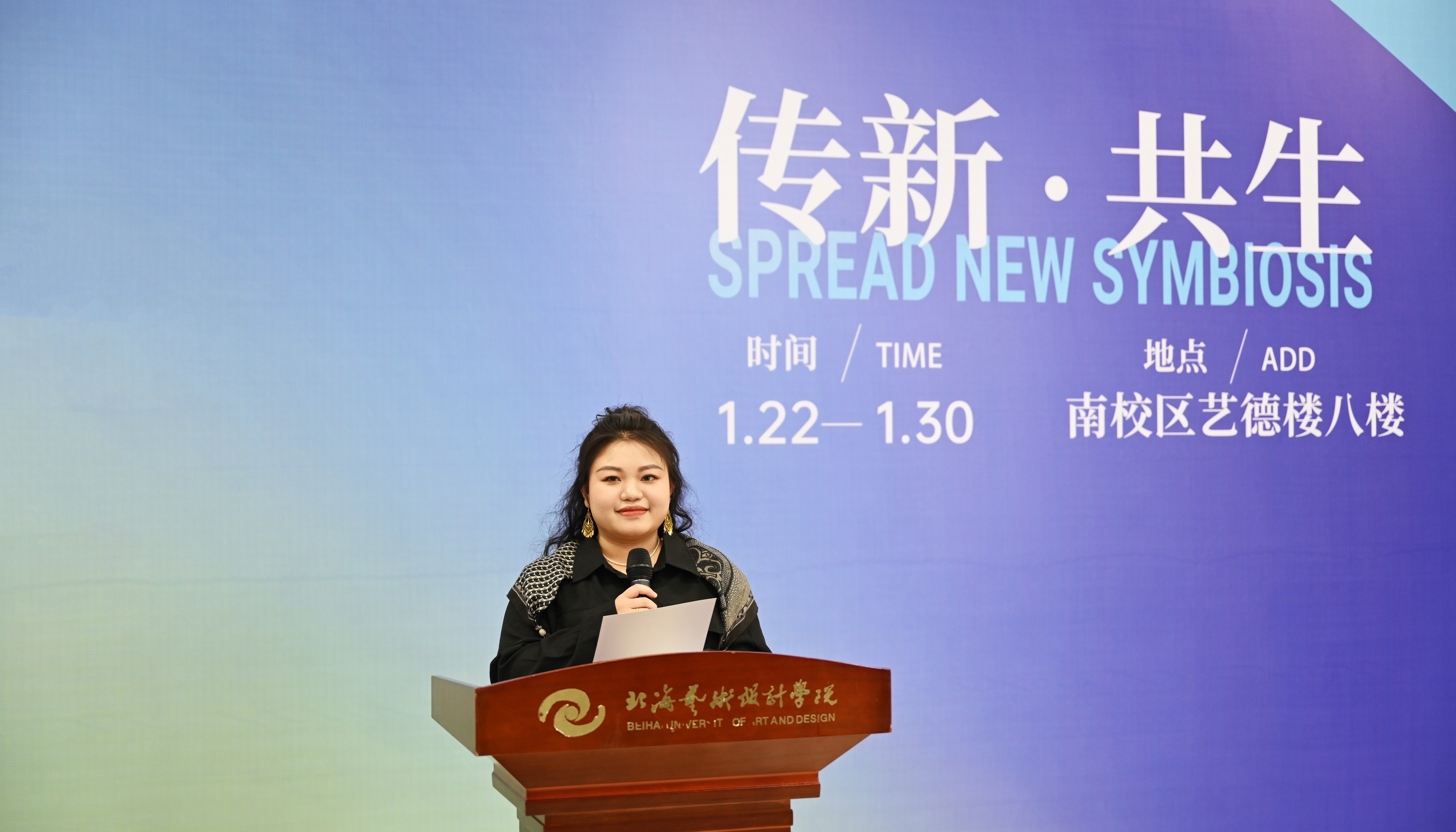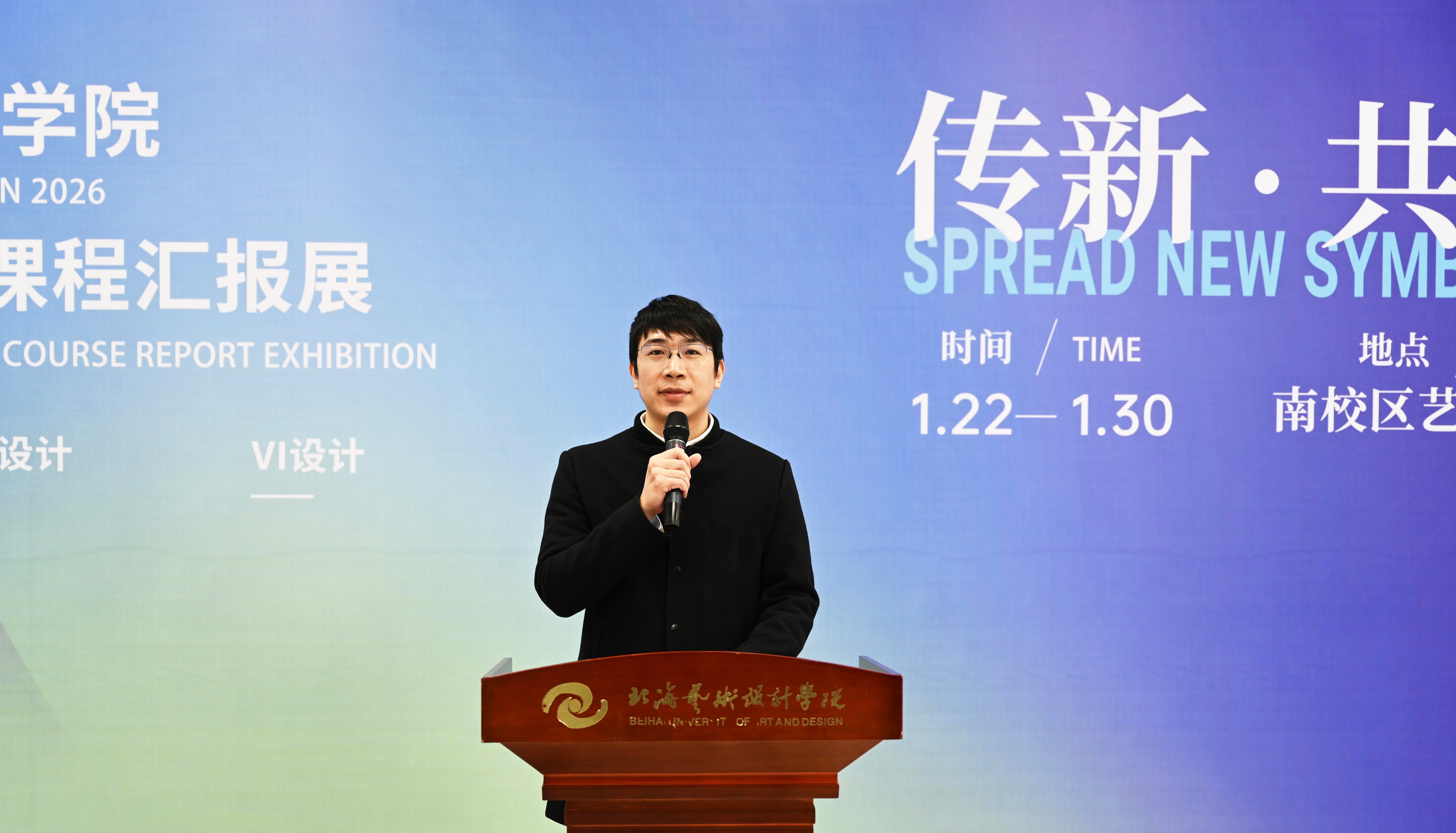 教师代表黄千羽对“传新·共生”主题内涵作了进一步阐释,并对学生创意成果给予肯定。她鼓励学生保持对文化传统的敬畏与对创新探索的热忱,期待本次展览成为传承与创新并重的新起点。