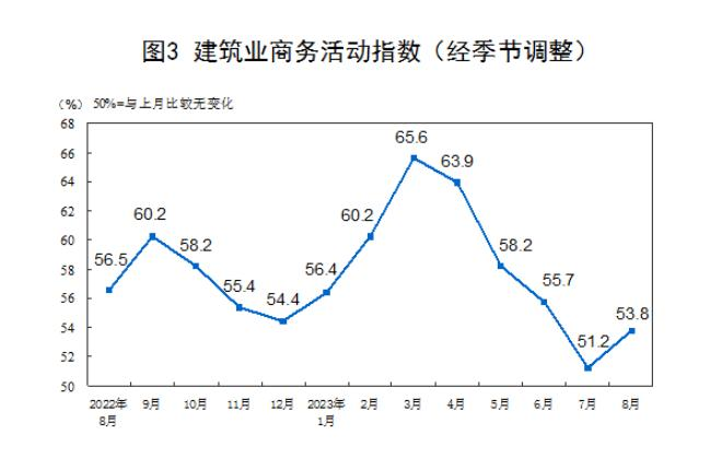 8月份,制造业采购经理指数(PMI)比上月上升0.4个百分点,制造业景气水平进一步改善;综合PMI产出指数比上月上升0.2个百分点;非制造业商务活动指数比上月下降0.5个百分点,但持续位于扩张区间,我国经济景气水平总体保持稳定。建筑业景气度下降还是回升?接着往下看:
