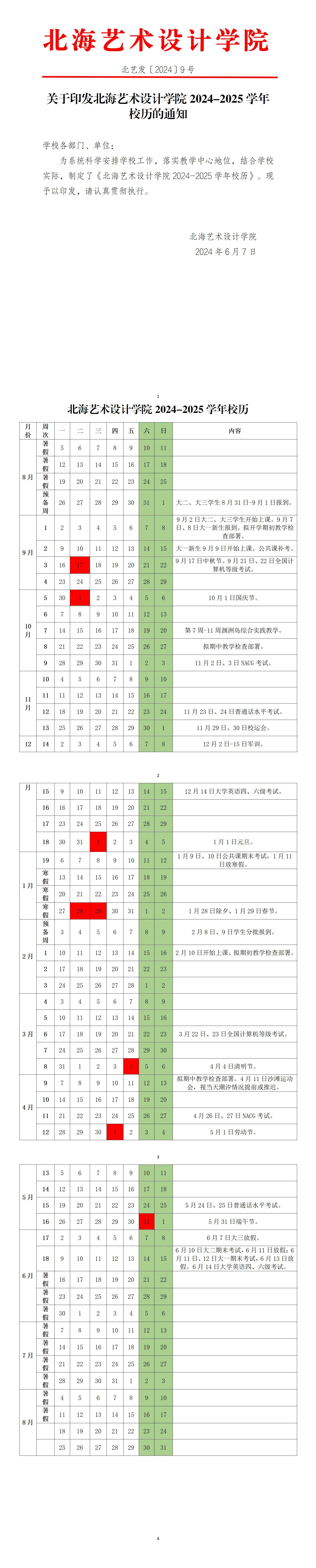 北艺发〔2024〕9号 关于印发北海艺术设计学院2024-2025学年 校历的通知