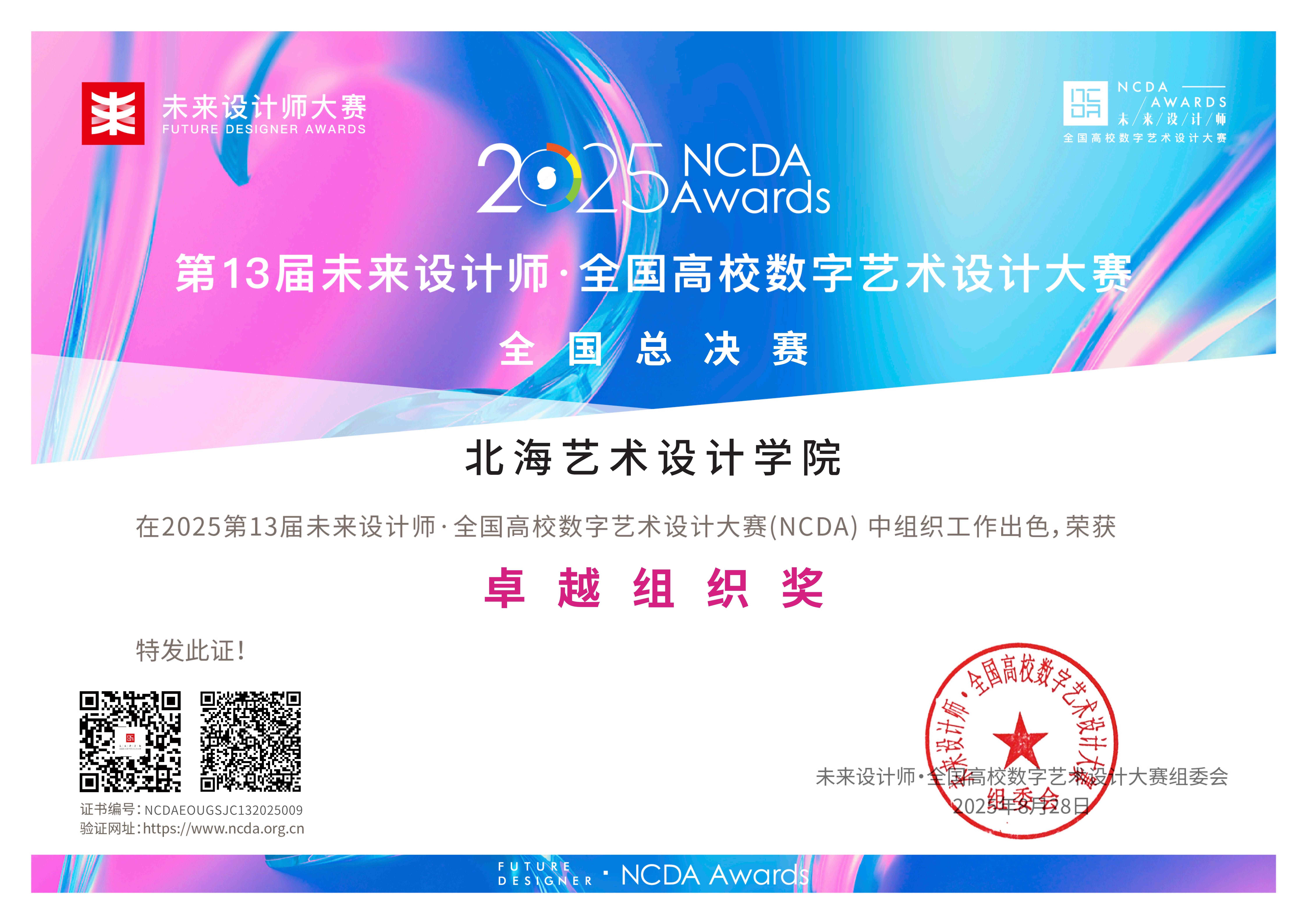 11月23日举行的第13届未来设计教育论坛暨NCDA颁奖典礼上,我院再创佳绩:师生团队共摘得全国一等奖3项、二等奖5项、三等奖4项;白建强、陈琛、贾政波等12位教师获评“优秀指导教师”;学校凭借完善的组织工作与突出的参赛成效,荣膺大赛“卓越组织奖”,全方位展现了我院在艺术设计教育与教学创新领域的综合实力。