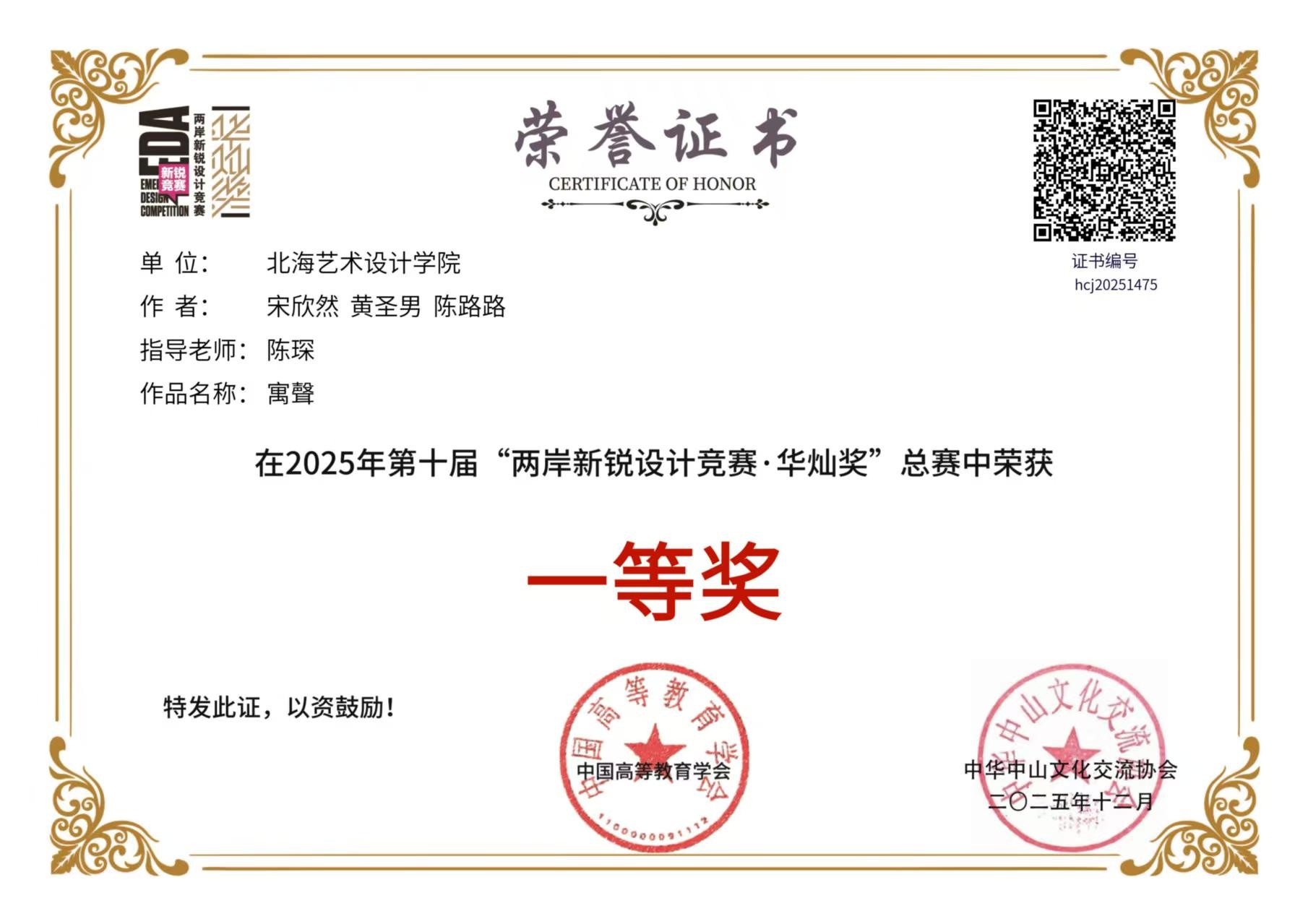 近日,第十届两岸新锐设计竞赛·华灿奖圆满落幕,设计艺术学院在此次竞赛中表现优异,共获国家级奖项3项,其中一等奖2项、二等奖1项;获省级奖项6项,其中一等奖1项、二等奖2项、三等奖3项。