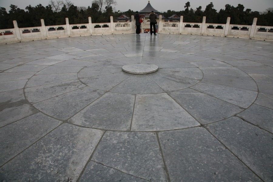 圜丘坛是举行冬至祭天大典的场所,主要建筑有圜丘、皇穹宇及配殿、神厨、三库及宰牲亭,附属建筑有具服台、望灯等。圜丘明朝时为三层蓝色琉璃圆坛,清乾隆十四年(1749)扩建,并改蓝色琉璃为艾叶青石台面,汉白玉柱、栏。圜丘形圆象天,三层坛制,高5.17米,下层直径54.92米,上层直径23.65米,每层四面出台阶各九级。上层中心为一块圆石,外铺扇面形石块九圈,内圈九块,以九的倍数依次向外延展,栏板、望柱也都用九或九的倍数,象征“天”数。