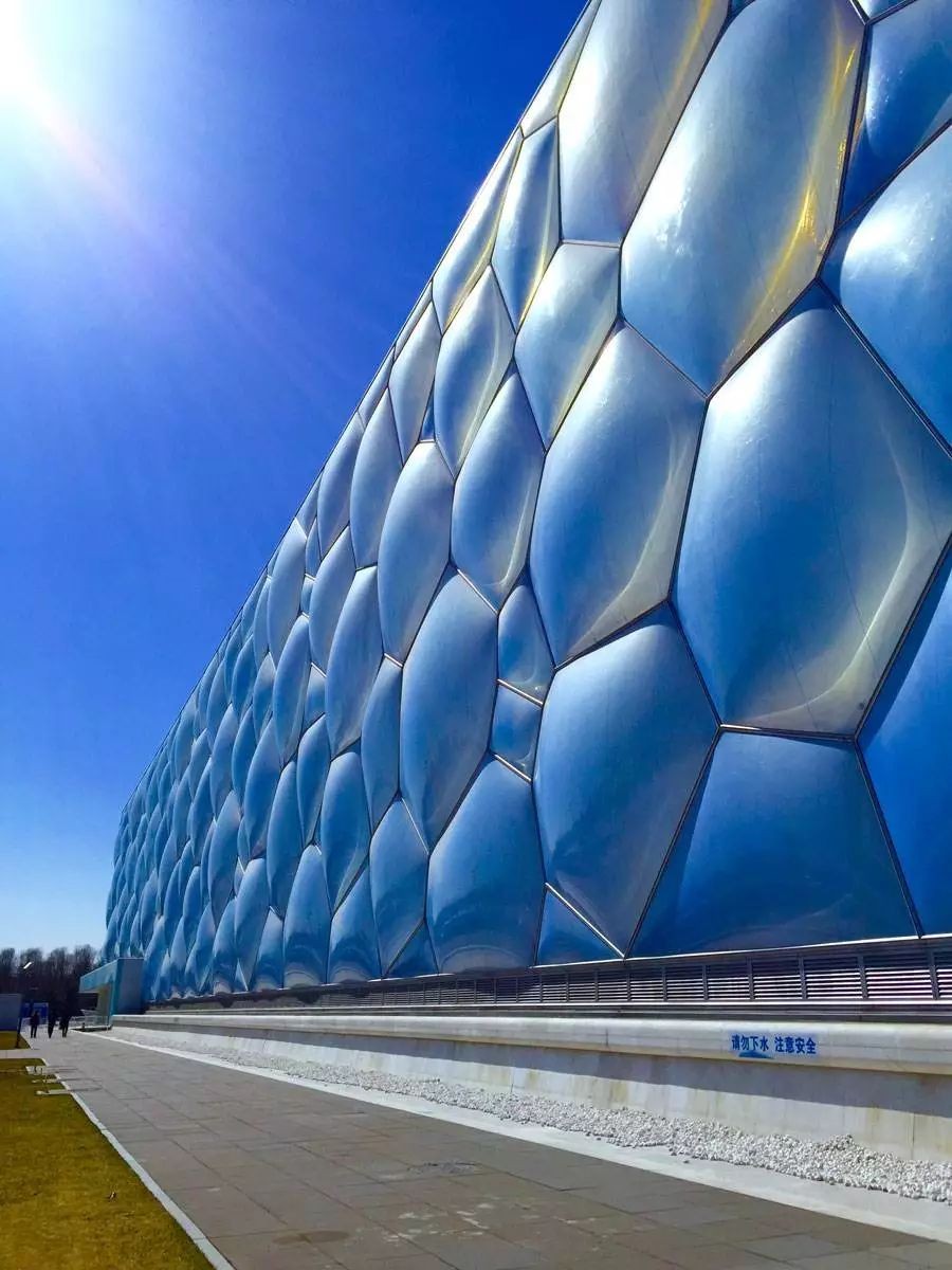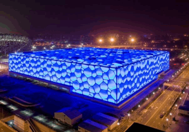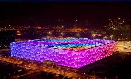 "水立方"是北京奥运会国家游泳中心,它的膜结构是世界之最。它是根据细胞排列形式和肥皂泡天然结构设计而成的,这种形态在建筑结构中从来没有出现过,创意十分奇特。