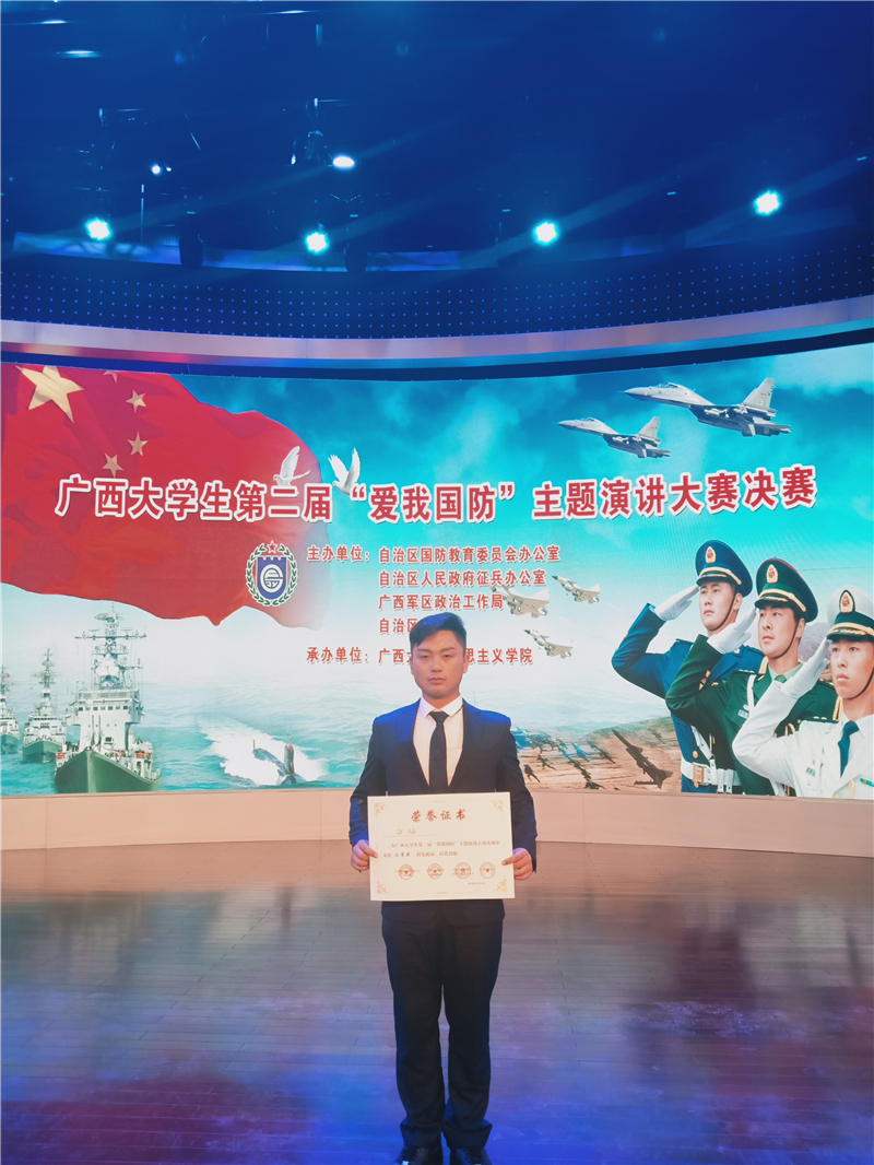 11月10日上午,由自治区国防教育办,自治区征兵办、广西军区政治工作局、自治区教育厅联合举办的广西大学生第二届“爱我国防”主题演讲大赛的决赛,在广西大学拉开帷幕。我校建筑学院土木17级学生张猛在项家祺老师的指导下代表学校参加了此次比赛,经过激烈的角逐,我校的比赛作品《爱我国防 牢记使命》荣获比赛二等奖。