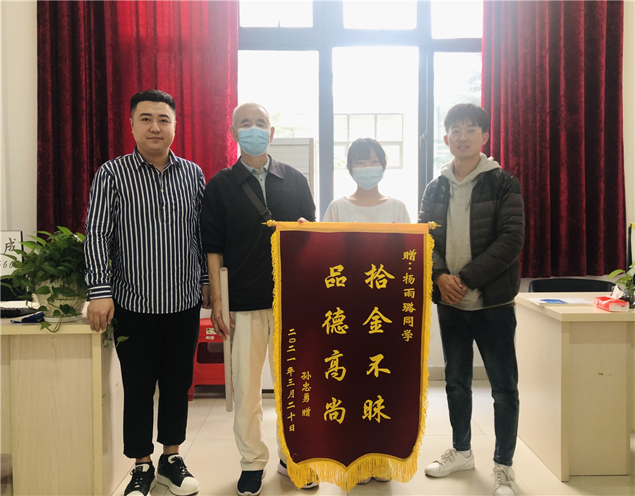 拾金不昧是一个人良好品德和崇高风尚的体现,也是当今和谐社会乐章的一个美好音符。3月26日,我校设计学院2018级学生杨雨露及班主任张伟峰收到了一位失主送来的一面锦旗和一封感谢信。