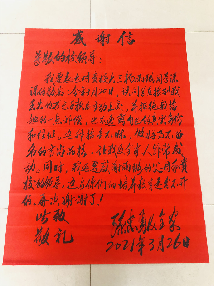 3月26日,失主为表达感谢,专门制作了锦旗和表扬信送到学校,赞扬了杨雨露同学拾金不昧、乐于助人的高尚品德。